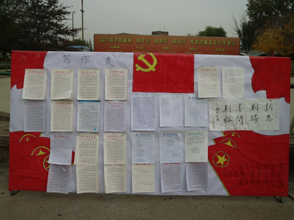海洋公司党员工作站结合工作实际,将十九大报告全文形成精炼的学习资料,组织全院员工进行学习。员工党员充分发挥带头作用,带领全院员工将自己的所学所感以丰富多样的形式展示出来,参与度高达90%。学习成果展示活动共收到作品271件,其中写作类作品195篇,原创诗歌19篇,板报类作品36幅,书法10幅,绘画11幅。作品形式丰富多彩,内容思想真实深刻,一幅“数风流人物,还看今朝”的书法作品苍劲有力,展示了海洋学子蓬勃向上,激流勇进的时代精神;一幅“不忘初心、牢记使命”的剪纸艺术栩栩如生,凝结了员工党员不负重托,一往无前的坚定信念;一首“你好,新时代”的原创诗歌气势恢宏,表达了新时代青年心系祖国,心有大我的家国情怀;“山海情”支教服务团队的摄影作品,新颖独到,展现了志愿者们无私奉献,勇于担当的服务精神;“心向十九大”、“共筑中国梦”等手绘板报线条柔和、色彩饱满,抒发了莘莘学子对祖国的大好河山、大美风景的无限热爱。经评委组评选,共选出李慧敏、陈怡乐、闫煦等同学的五十余幅优秀作品进行展出。展出伊始,同学们纷纷在展板前驻足、观看、热议,学习气氛浓厚,大家用实际行动响应党的号召,积极学习并践行十九大精神。