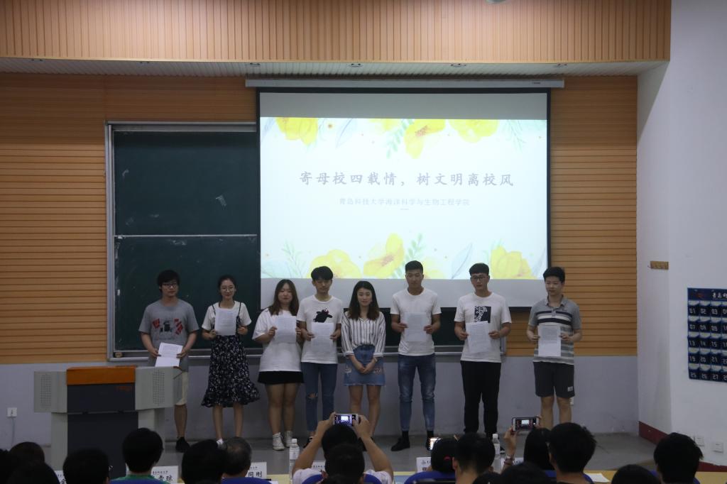 为树立文明离校之风,深化安全离校意识,促进师生之间的交流,营造温馨和谐的氛围,6月18日下午2:00,海洋公司在二教101举办“寄母校四载情,树文明离校风”主题活动。此次活动邀请了海洋公司党总支书记刘同刚、党总支副书记兼副经理卢中彬、2015级班主任代表以及2015级、2016级、2018级辅导员老师出席,海洋公司全体2015级毕业生参与。
