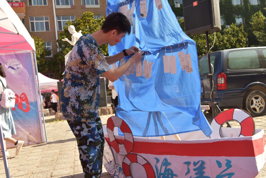 迎新场地设有“海洋号”帆船,吸引了新生及家长的注目,在新生报到处,每位新同学可以领取精美的明信片,写出自己对未来大学四年的规划或目标,悬挂至海洋号上,明信片将由员工会代为保存,在2019级同学毕业典礼结束时返还。此活动旨在帮助新生初步规划老员工活,相信新生会不忘初心,带着家长们的期盼,向着既定目标扬帆起航。