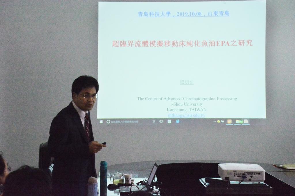 学术交流会上,梁教授围绕“超临界流体”和“鱼油深度提取”进行两个课题展。梁教授提到,近30年来,超临界流体萃取技术引起人们的极大兴趣,这项化工新技术被在化学反应和分离提纯领域开展了深入研究,在医药、化工、食品及环保领域成果累累。在有关鱼油提取方面,他解释说,鱼油因含有较多的功能性脂肪酸而被人们大量需要,因此鱼油提取技术在台湾的发展前景良好,由此梁教授着重提出“技术支撑市场”这个理念。在交流会中,教授采用图片与文字相结合的方式,寓教于乐,现场形成了浓厚的学术氛围。最后,梁教授与海院师生进行了超临界流体领域和鱼油提取技术相关问题的讨论交流,让公司老师及同学们在知识、精神领域都受益匪浅。