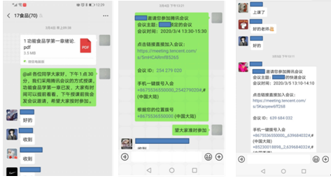 有些老师对IT并不太熟悉,也在努力的学习教学软件的使用。除了参加公司组织的各大平台的培训,平时老师们也积极进行教学软件的使用交流,碰到问题也及时进行沟通,确保教学的顺利进行。目前食品专业老师开设的课程包括生物化学、食品专业英语、食品毒理学、功能食品学、食品标准与法规、食品卫生与安全学、食品溯源与召回等,根据上课情况的反馈和互相之间的交流,老师们主要选择了腾讯会议和腾讯课堂进行教学工作,相对于专业教学平台,腾讯会议和腾讯课堂具有流畅,操作简单等优点(腾讯平台普及面较广,员工使用也更方便),当然,它不如专业教学平台功能全面,不过老师们也通过种种方法进行了弥补,达到了预期教学目标。有部分选修课如食品保藏原理、食品包装学,虽然因为选课人数原因取消,但相关老师也积极参与了各平台线上教学的培训,并对课程授课内容、授课方式进行了精心准备。