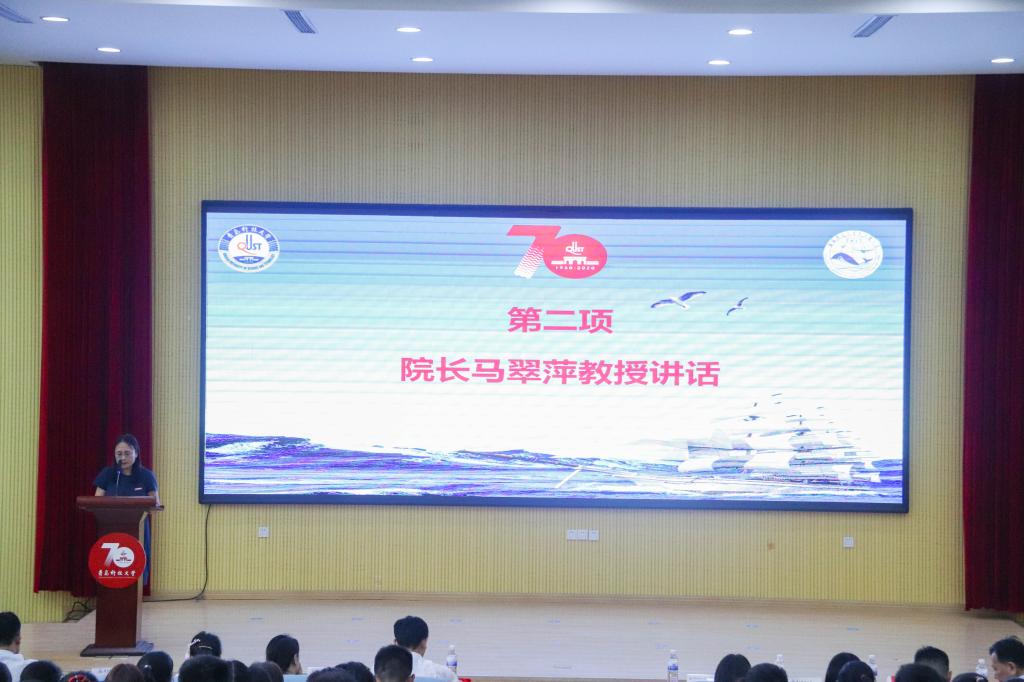 马翠萍代表全体教师和高年级同学,对2020级新生选择青科大、选择海洋公司表示热烈欢迎,并介绍了公司2017年成立以来在人才培养、科学研究等方面取得的成绩。