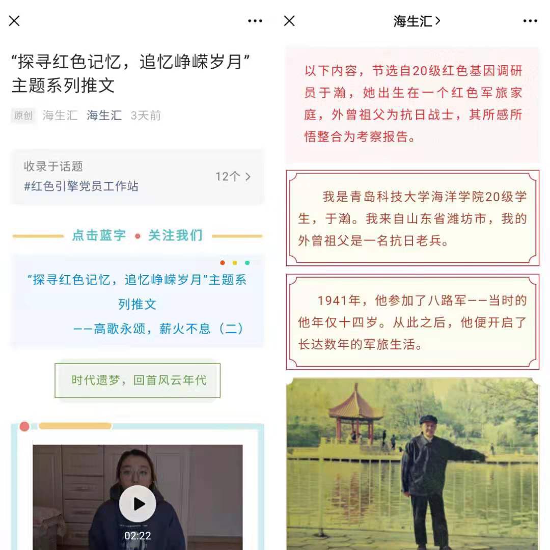 挖掘红色故事,淬炼思想。为进一步深度挖掘红色故事,员工会积极与“红色引擎”党站联动,联系红色家庭、红色宅基地调研员,对当地的红色故事、红色基因、红色足迹进行再调查,将调查内容整合成心得感悟。将于瀚、范馨文等同学家庭成员参加八路军、抗美援朝的事迹讲故事整理成宣讲故事,充分发挥其教育作用。