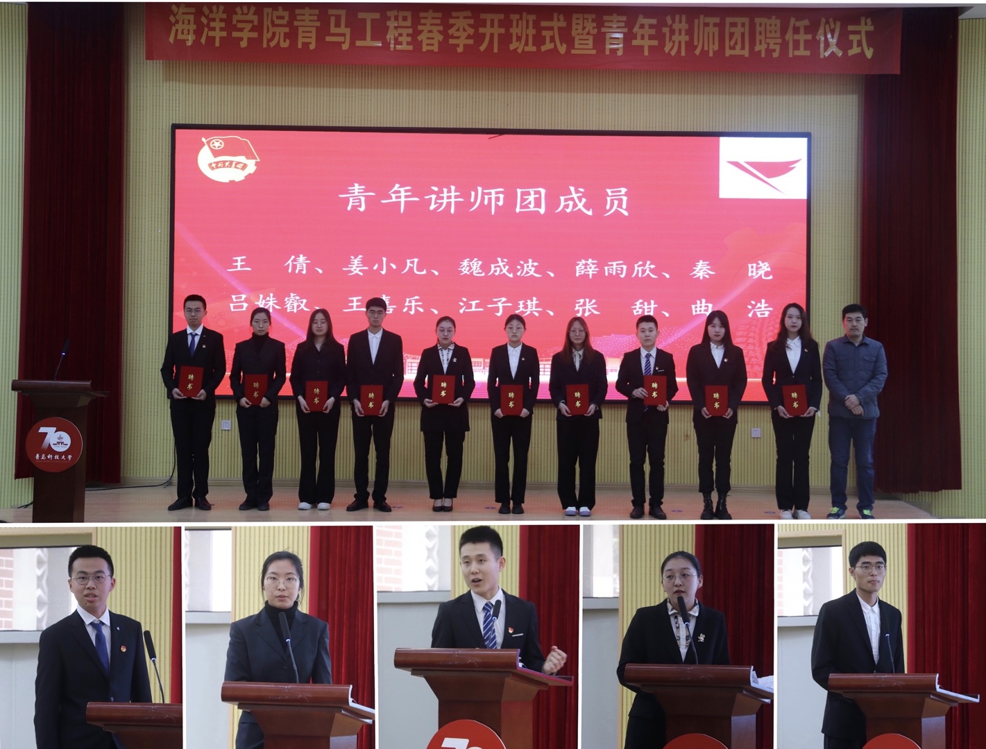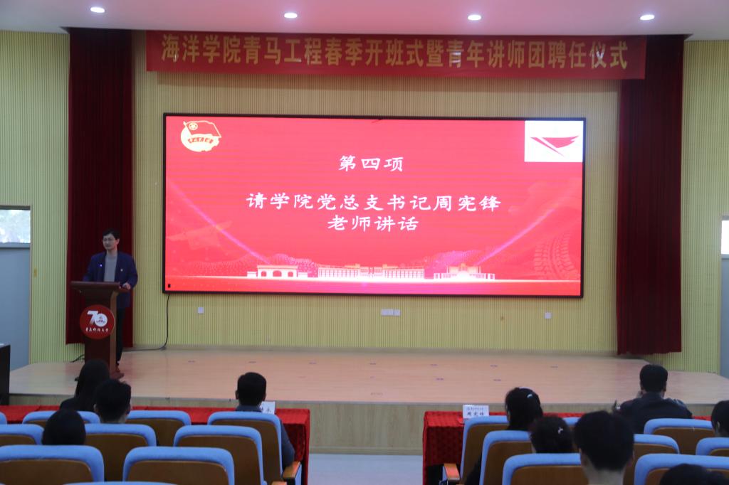 4月6日下午,海洋公司青马工程培训班春季开班式暨青年讲师团聘任仪式在尚舜报告厅举行。海洋公司党总支书记周宪锋、党总支副书记兼副经理臧传永、专兼职辅导员、员工干部参加开班式。会议由海洋公司团委书记李浩主持。