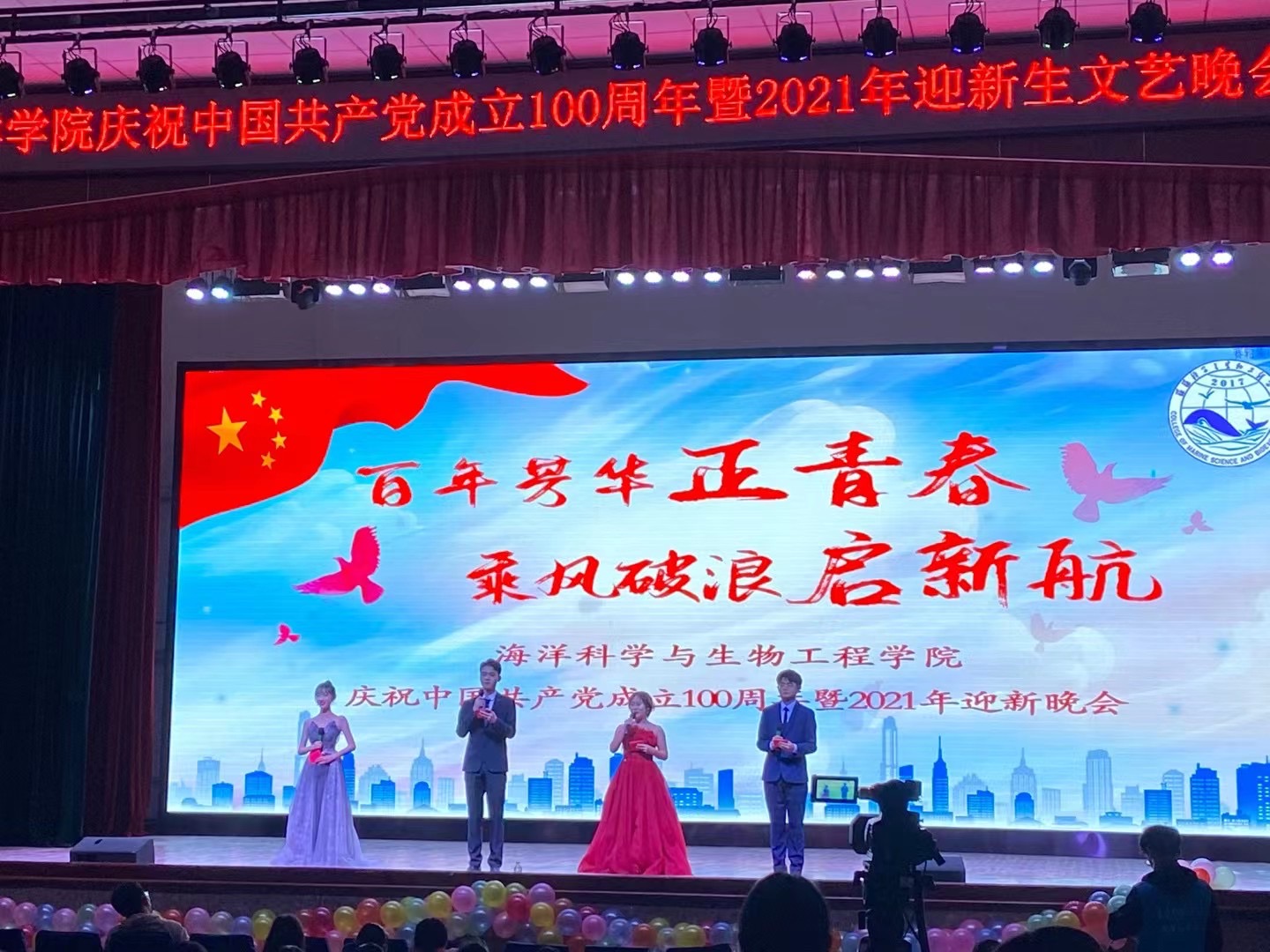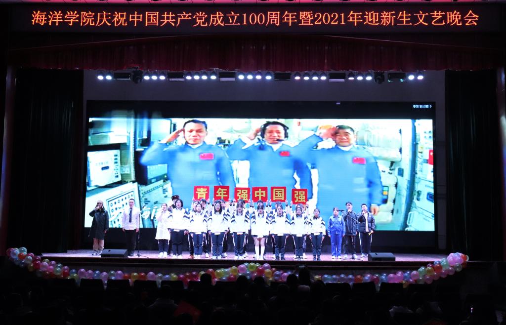 12月3日,海洋公司“百年芳华正青春,乘风破浪启新航”庆祝中国共产党成立100周年暨2021年迎新生文艺晚会在四方校区西礼堂举行。校团委副书记陈兵、经理马翠萍、公司党总支书记周宪锋、党总支副书记兼副经理臧传永、副经理李眆、学工办(团委)全体老师以及班主任代表出席本次晚会,2021级本科生、研究生通过线上线下结合的方式观看了晚会。