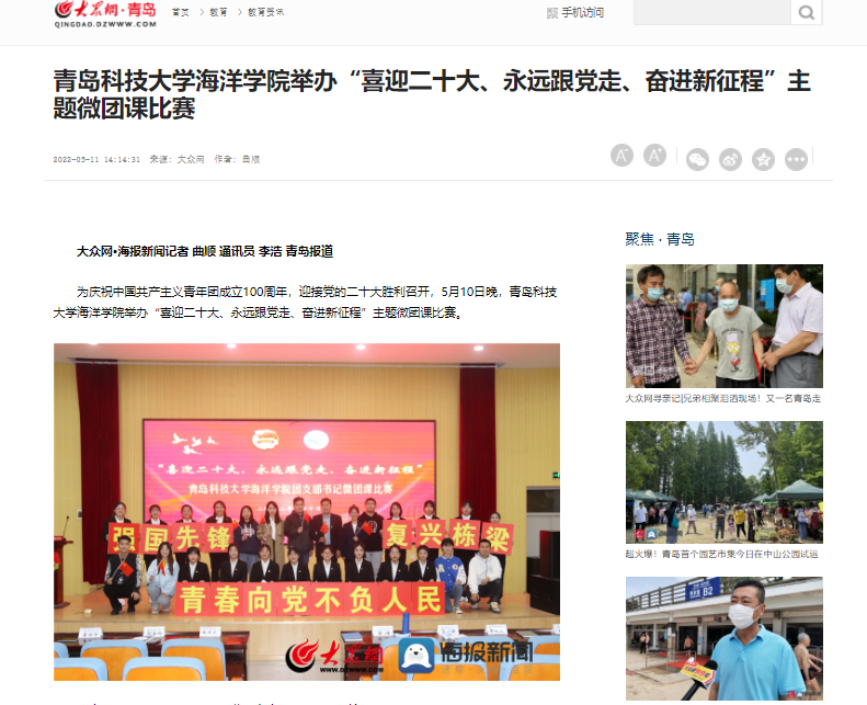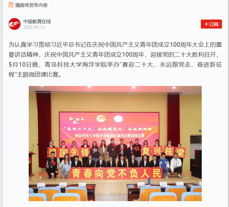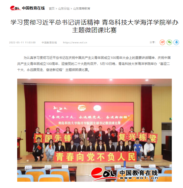 5月10日晚,betway西汉姆联官方官网海洋公司举办“喜迎二十大、永远跟党走、奋进新征程”主题微团课比赛。中国教育在线,青岛大众网、学习强国对主题微团课进行报道。