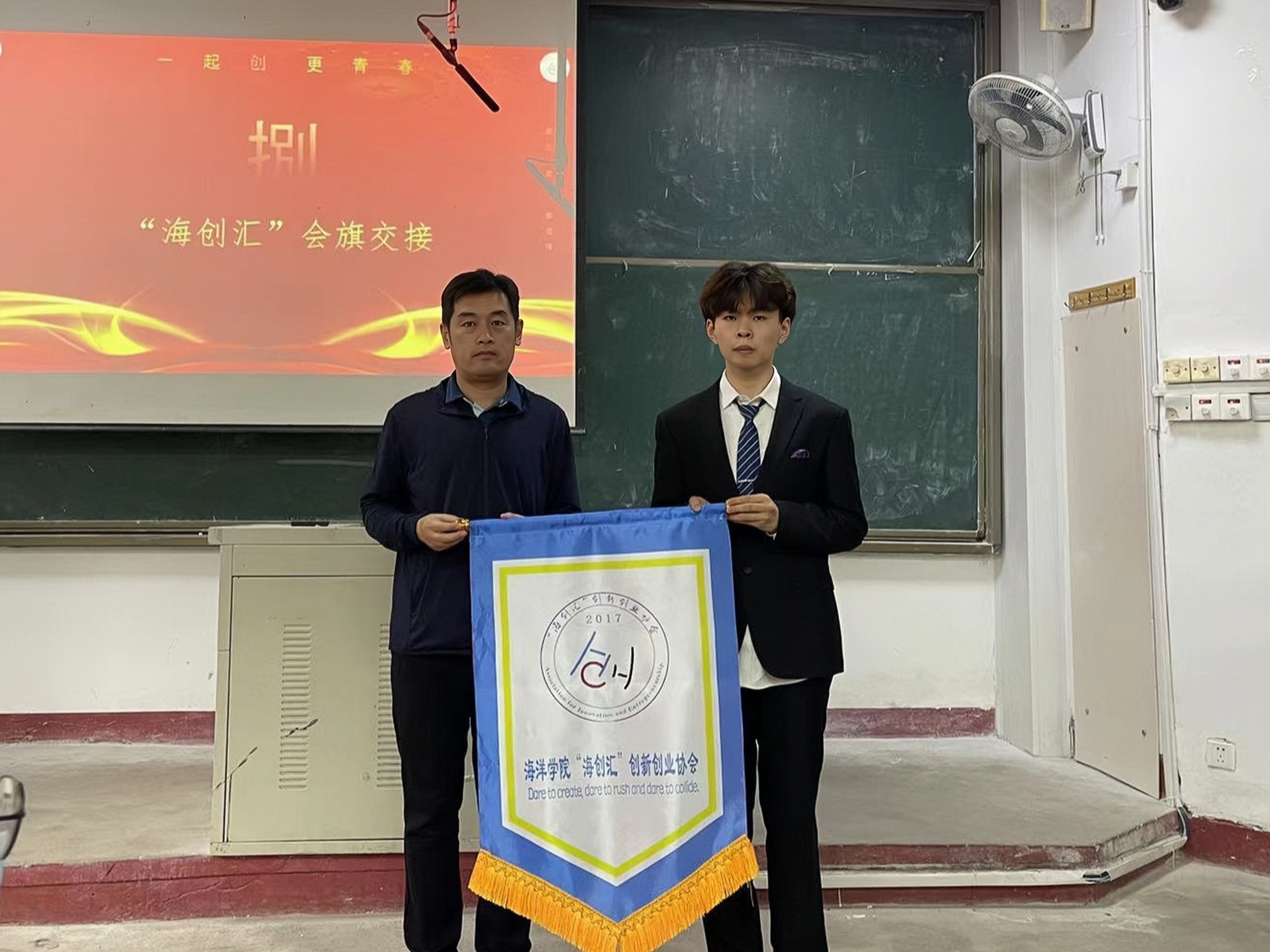 臧传永宣读第六届“海创汇”干部名单并颁发聘书,同时为新一届会长于洋同学授旗,正式开启“海创杯”科技成果交流展启动仪式,希冀在新学年里“海创汇”成员能够继续发扬海洋公司科研优良的良好风尚。
