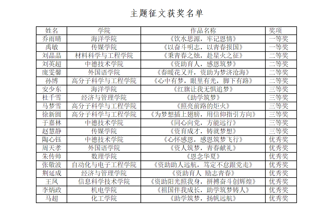 根据公司《关于开展2022年员工资助育人系列主题活动的通知》要求,海洋公司积极组织,号召员工参与活动。经公司(校区)推荐、资格审核、公司评审,海洋公司生物212乔雨晴荣获主题征文一等奖 ,生物212安少东荣获主题征文三等奖 ,生物212胡丹丹荣获宣传作品二等奖。