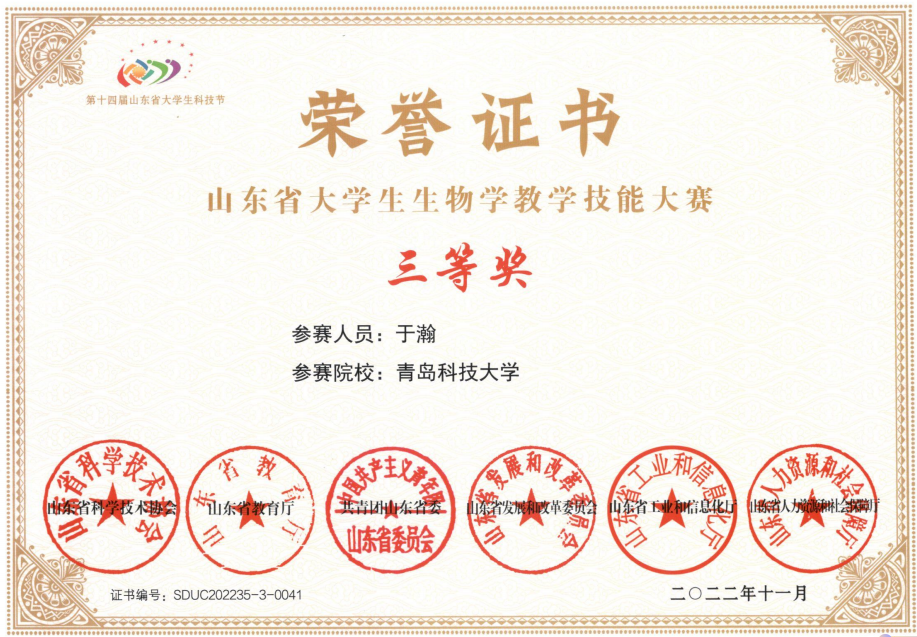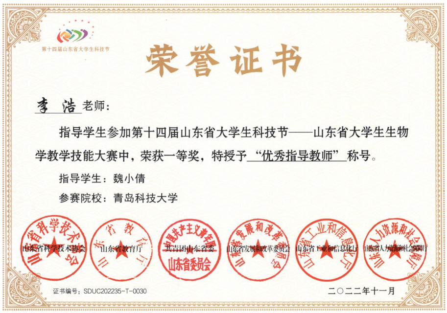 生物工程191班魏小倩同学荣获非师范本科组一等奖、生物工程202班于瀚同学荣获非师范本科组三等奖、李浩老师荣获优秀指导教师。