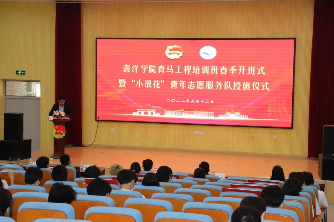 为深入贯彻领会习近平总书记在党的二十大上的重要讲话精神,进一步培养思想坚定、素质过硬、能力突出、格局远大的青年马克思主义者,11月12日,海洋公司“青马工程”培训班秋季开班仪式在四方校区讲学厅顺利举行。公司党总支书记周宪锋、党总支副书记兼副经理臧传永、学工办(团委)全体专兼职老师以及部分员工干部、员工志愿者参与本次仪式。
