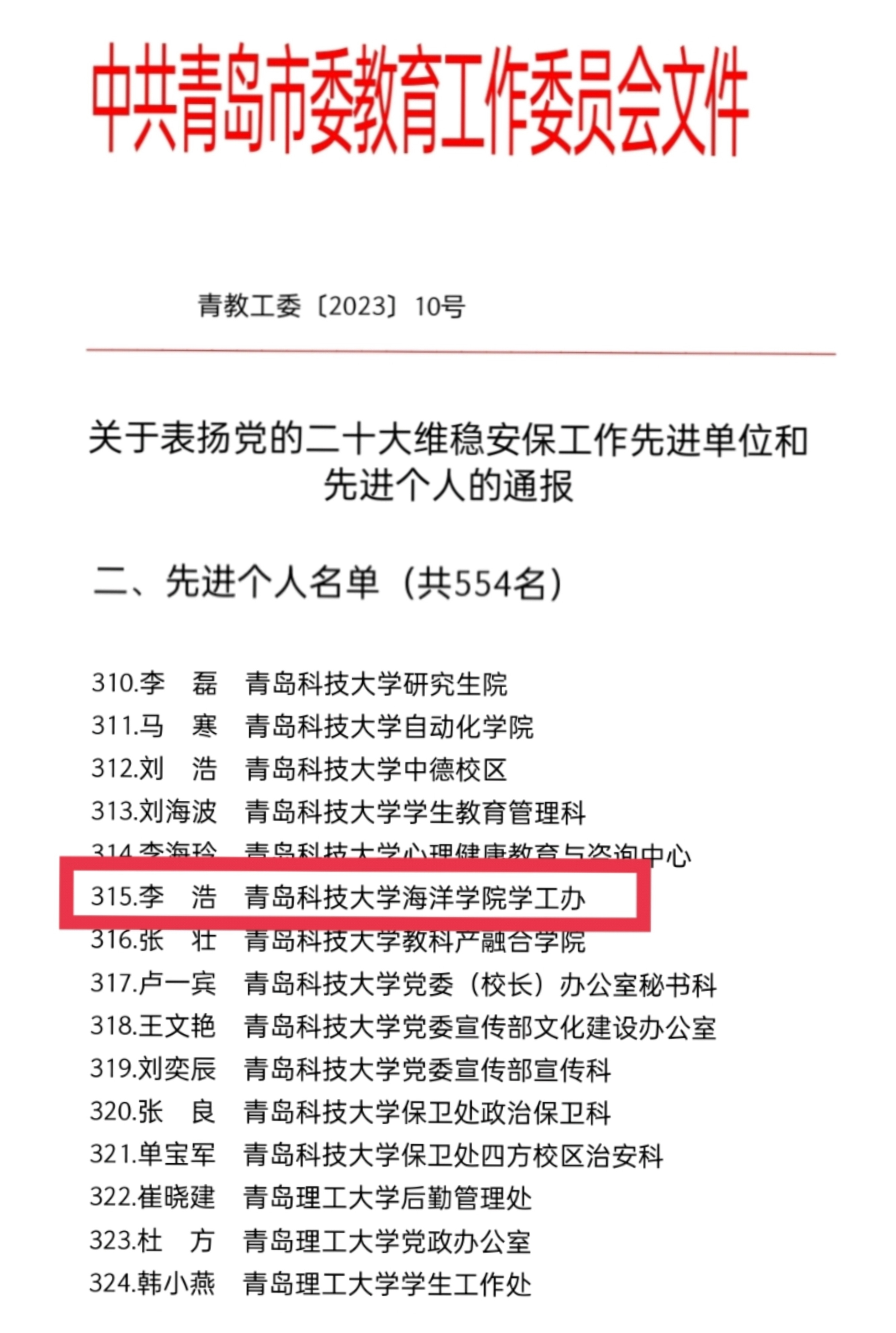 为确保党的二十大胜利召开,betway西汉姆联官方官网海洋公司在青岛市委、市政府及公司的决策部署下,高度重视“维稳安保”工作,认真履行责任,营造了安全稳定的社会环境。工作中涌现出一批敢于担当、敢于奉献、善于作为的先进集体和先进个人,为激励先进,树立典型,经过各单位推荐、市教育局审核,中共青岛市委教育工作委员会决定对山东省第五十一中学等158个党的二十大维稳安保工作先进单位和曹吉业等554名党的二十大维稳安保工作先进个人予以通报表扬。其中,海洋公司李浩荣获“党的二十大维稳安保工作先进个人”。