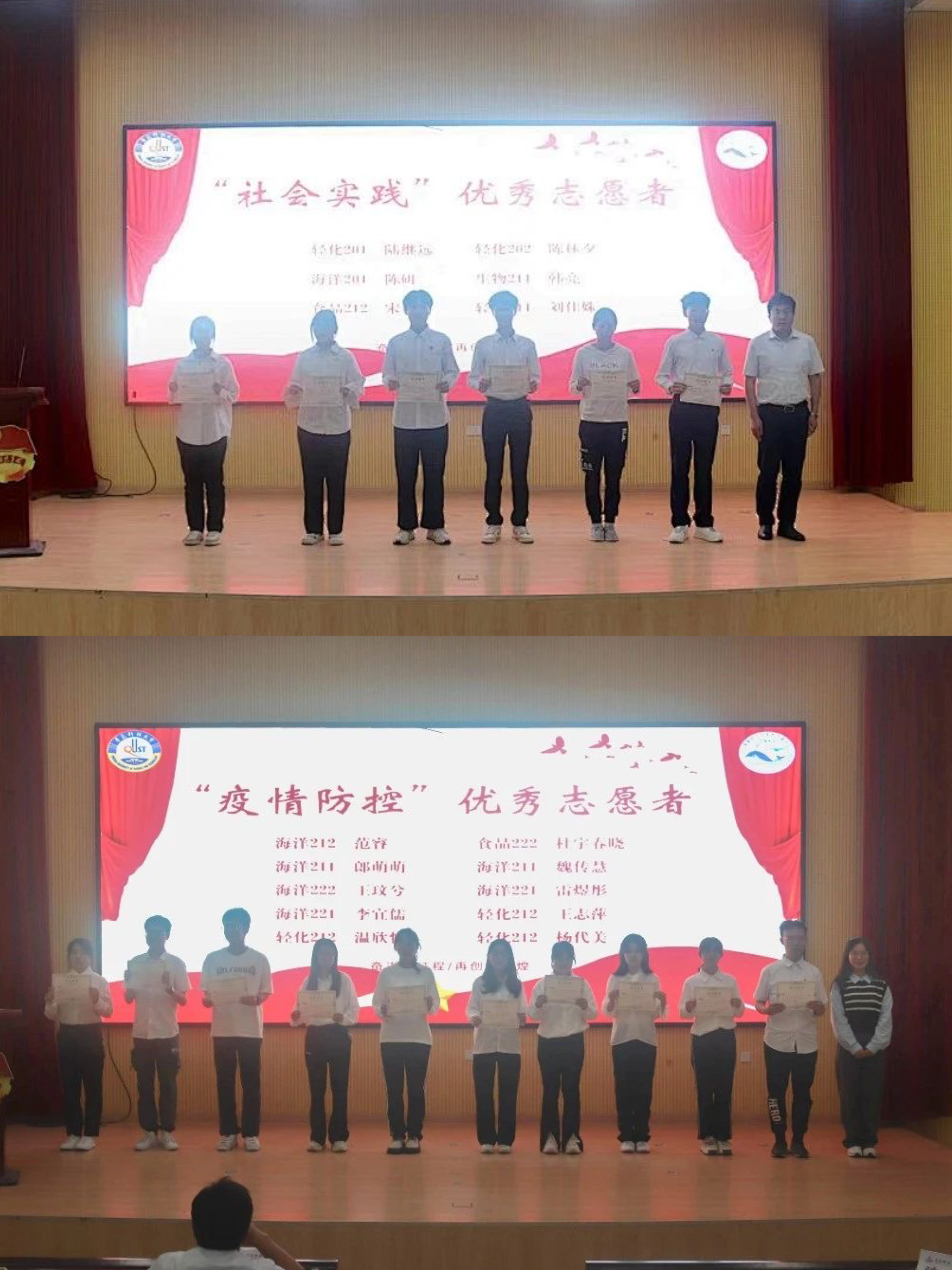 会上,宣读了《海洋公司关于表彰疫情防控优秀志愿者和社会实践优秀志愿者》的决定,由李浩、吕珊珊为受表彰同学进行颁奖。