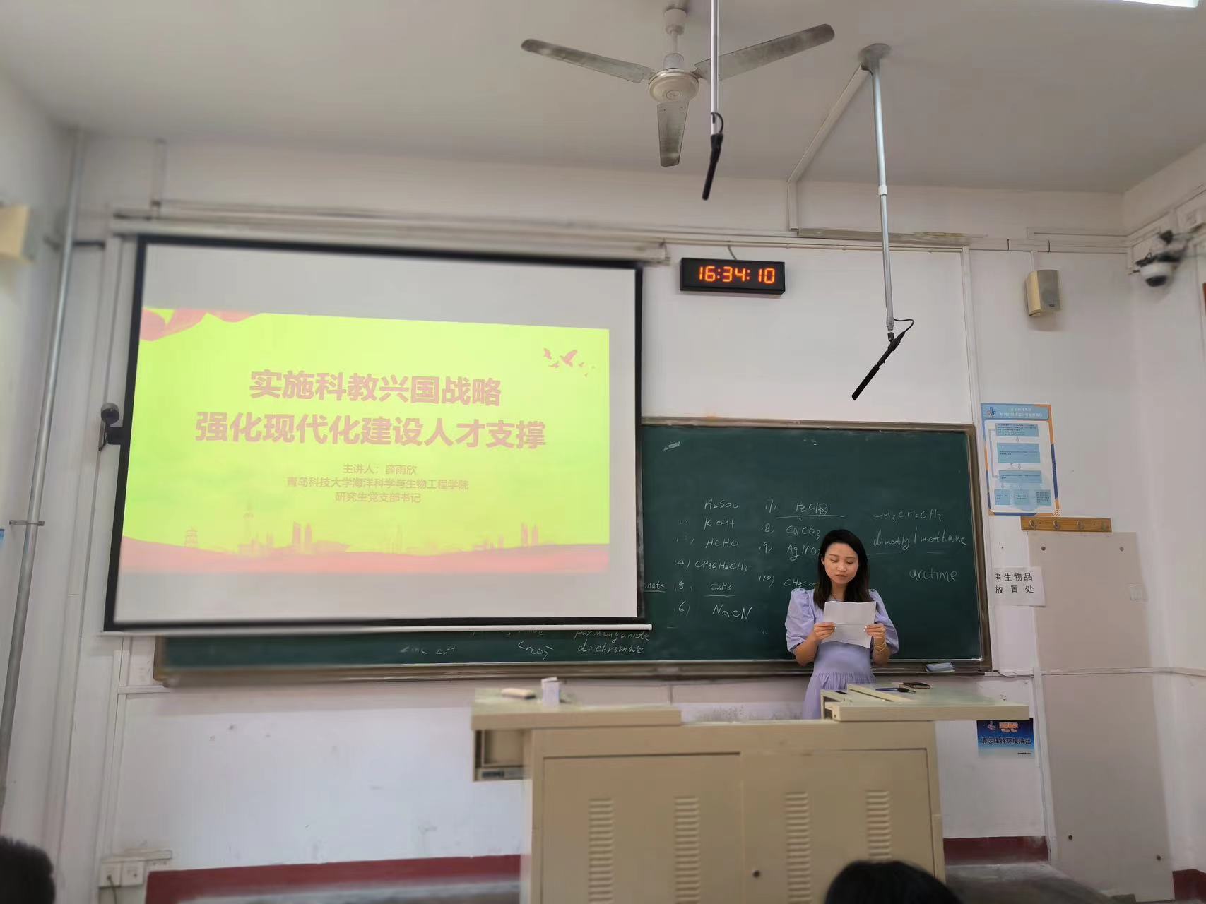 研究生党支部书记薛雨欣以“实施科教兴国战略,强化现代化建设人才支撑”为题,从“二十大关于科教人才的工作部署”和“青年人的担当和使命”两方面讲述。重点强调习近平总书记提到的“必须坚持科技是第一生产力、人才是第一资源、创新是第一动力”,青年人要扛起担当和使命,新征程是充满光荣和梦想的远征。蓝图已经绘就,号角已经吹响。我们要踔厉奋发、勇毅前行,努力创造更加灿烂的明天。作为研究生党员,要心怀远大理想,脚踏实地,让青春之光闪耀追梦征程!