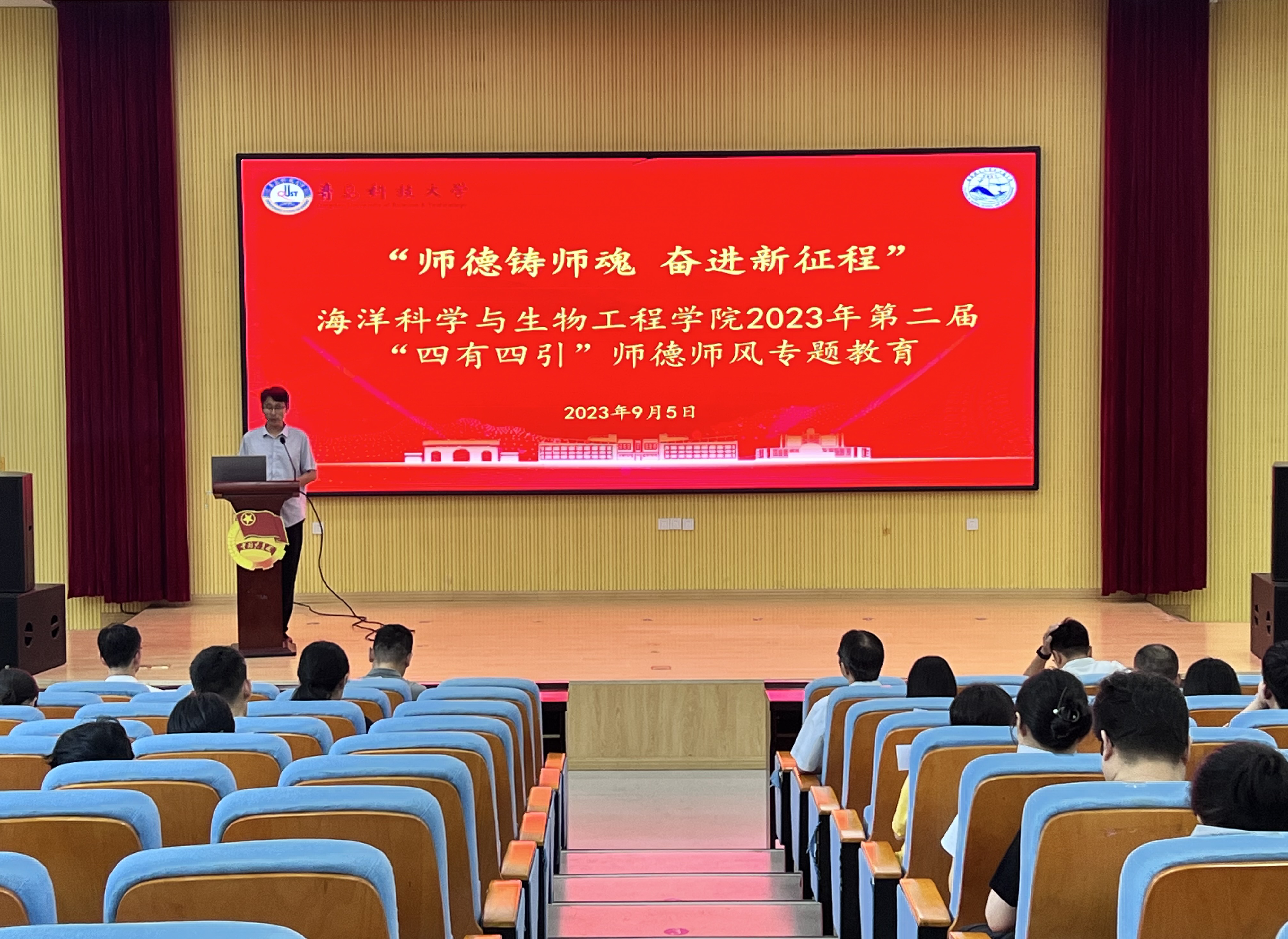 9月5日,海洋公司在尚舜报告厅举行“师德铸师魂 奋进新征程”第二届“四有四引”师德师风专题教育大会,公司全体教师参加会议。会议由副经理顾玉超主持。