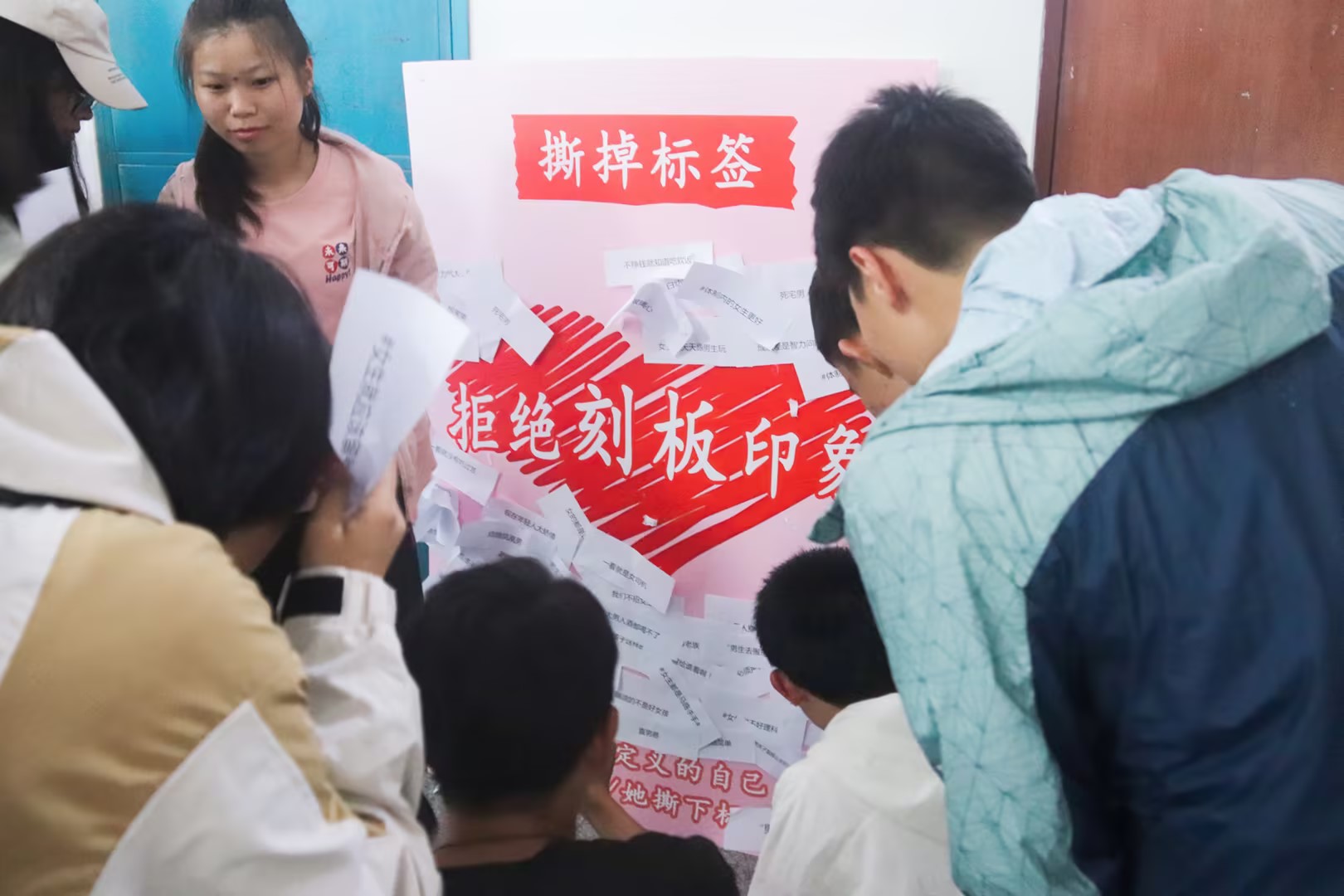 公司组织心理委员及员工会成员在特别制作的KT板上粘贴了众多消极“标签”,并为同学们准备了便利贴,引导同学们用便利贴写下对自己、他人的鼓励话语,来替换消极的自我“标签”。有趣而新颖的活动形式吸引了众多同学驻足参与,当看到展板上贴满带有刻板印象的“标签”时,纷纷表示感同身受并当场撕下,同时留下励志“标签”,鼓励自己,温暖他人,释放心灵,自我激励。