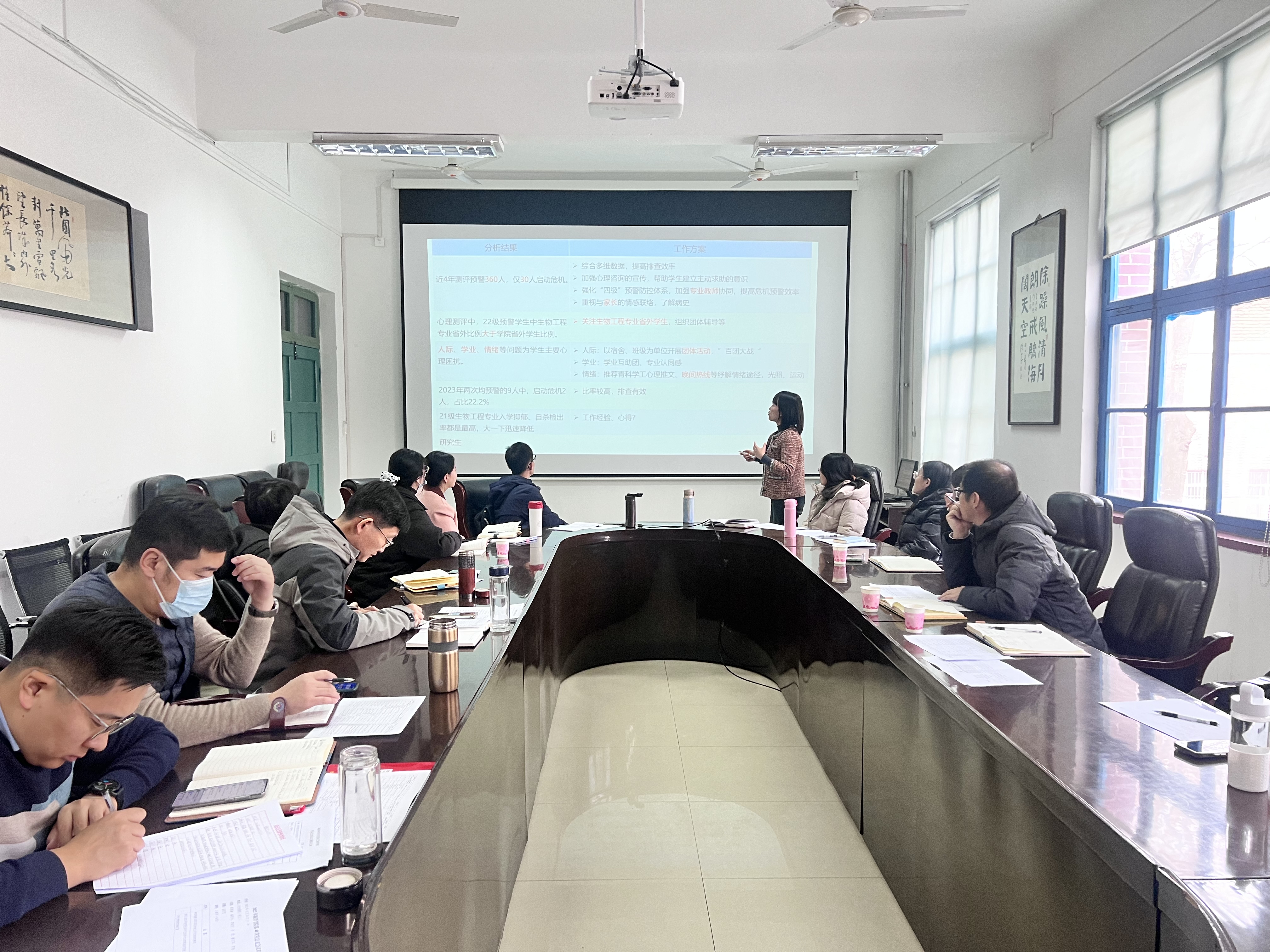 周宪锋代表公司对曹永俊一行来院开展老员工心理健康工作表示欢迎和感谢,要求各支部、教研室高度重视心理健康教育和危机处置,形成工作合力,维护公司安全稳定局面。曹永俊介绍了心理健康服务下基层开展情况,表示将常态化加强与公司沟通互动,科学应对,合理施策,切实维护大学身心健康安全。心理咨询中心教师王珊对比梳理了海洋公司本科生及研究生各年级、各专业员工近年来心理健康测评数据动态变化,并介绍海洋公司员工心理危机和个体咨询情况。心理咨询中心主任李海玲结合海洋公司心理健康测评分析结果,聚焦重点问题,提供“订制式”心理健康教育措施和方案。与会人员结合各自工作经验,就进一步加强心理健康宣传、教育、服务工作进行了交流讨论。