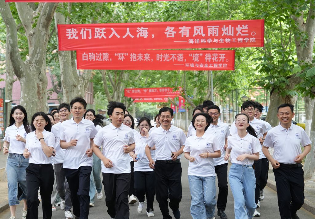 毕业生们穿着统一的毕业跑纪念T恤在网球场集合,飘扬的旗帜、动感的旋律、热闹的人群烘托着浓浓的毕业季氛围。顾玉超、周宪锋为毕业跑活动发令。伴随着嘹亮的发号令,环校园毕业跑活动正式开跑。师生一同从网球场出发,跑过一号行政楼、图书馆、小五四等6个校园地标打卡点,用奔跑的热情为毕业生送上祝福。