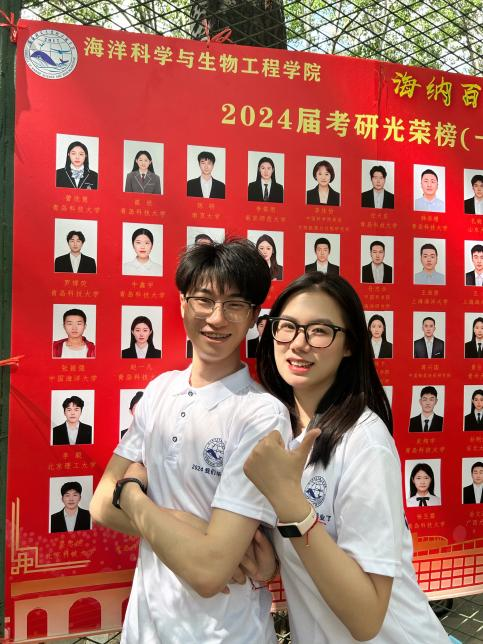 两人大一时作为同专业的同学而相识,在一次次交流中逐渐变得熟络,有着相同目标的两人之间很快便互相吸引。之后,两人共同去图书馆学习,在第一学期,李筱雨成功获得了班级第一的好成绩。日迈月征,暮来朝去,两人对彼此的了解也一步步加深。2022年暑假,两人组队参加全国老员工创新创业方法大赛。有了两年的感情基础,他们在这次比赛中他们配合得相当默契,最终获得了省级立项的好成绩。在这一年中,两人各自进步,陈研成功当选海洋公司员工会轮值主席一职,李筱雨也担任公司“海之韵”科普志愿服务队的队长。两人彼此陪伴、互相鼓励,成为了对方前行路上的光芒。进入大三,陈研和李筱雨面对考研研压力,两人不敢懈怠,除了紧张的专业学习,他们一起整理院校信息、准备材料、学习专业课。在备考过程中,他们督促彼此学习,分享彼此喜悦,也替彼此缓解焦虑。一来一往中,两人的感情也愈来愈牢固。在他们不懈的努力下,陈研成功考入了南京大学,李筱雨成功考入了南京师范大学。从青岛到南京,这一路上都是他们彼此最好的印记。