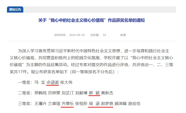 据悉,本次活动以“我心中的社会主义核心价值观”为主题,征集视频、图画、征文、书法等作品,活动最终评选出一、二、三等奖共17件。