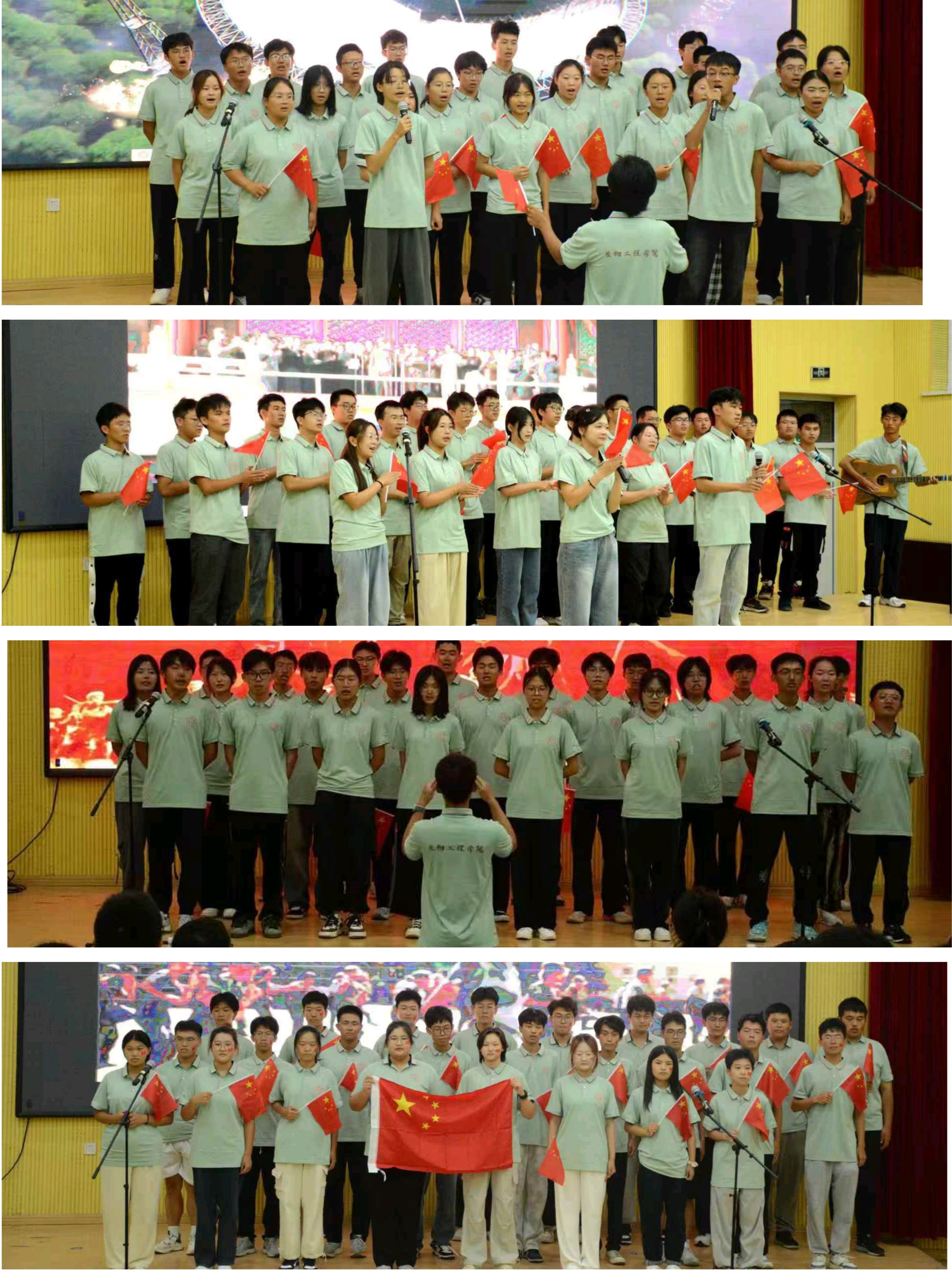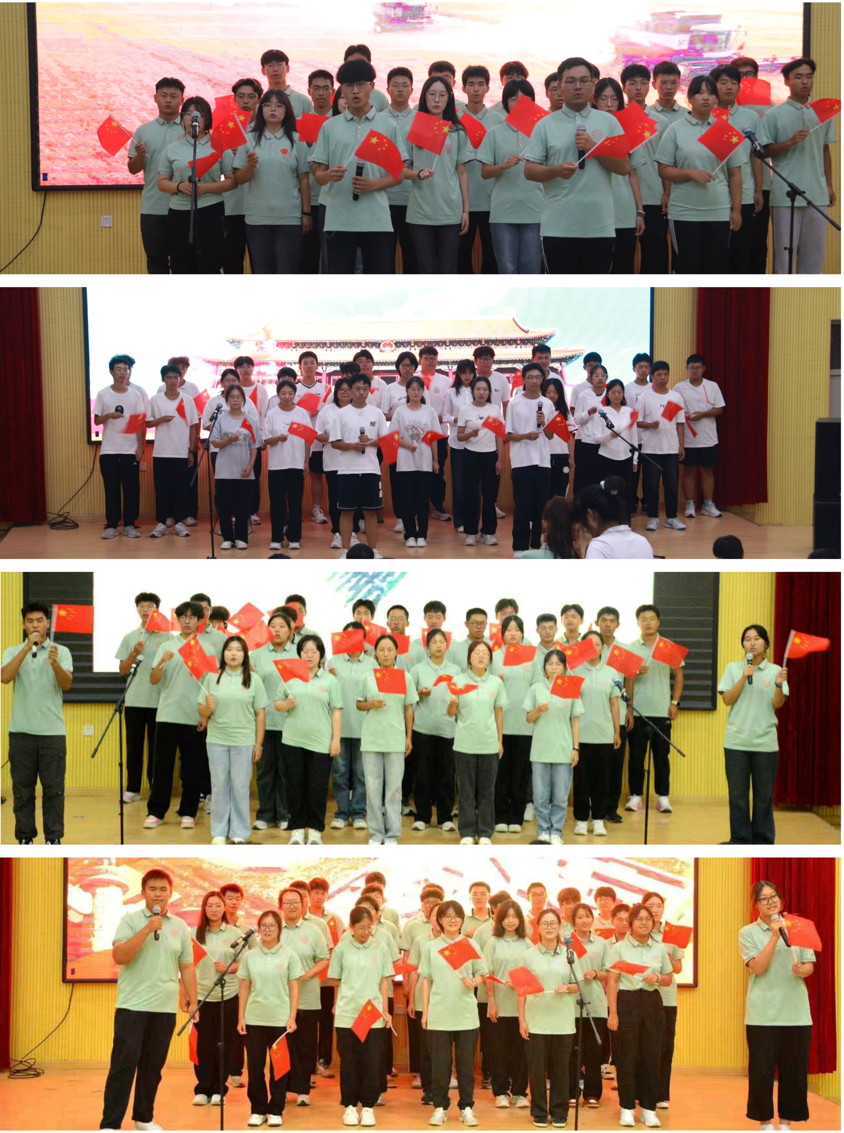 比赛开始前,全体师生共唱国歌。激昂的旋律与有力的歌声在礼堂内激荡,表达了全体师生浓厚的爱国情怀。随后,各班先后进行校歌与自选歌曲合唱展示。