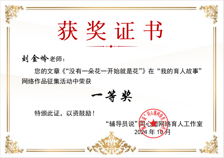 公司辅导员刘金岭撰写“没有一朵花从一开始就是花”的育人故事荣获一等奖。