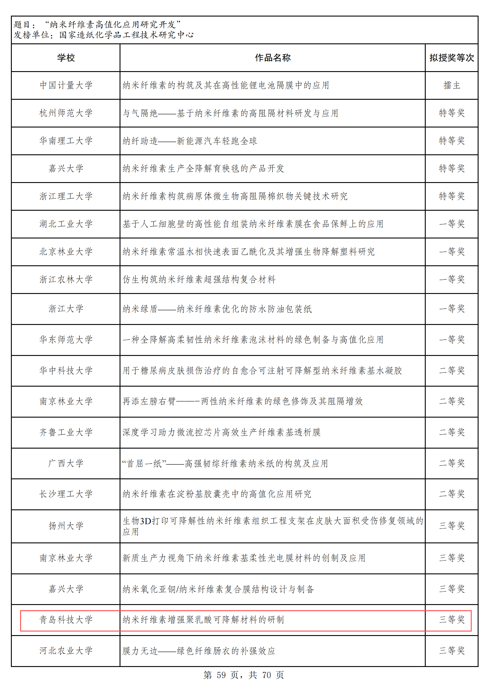 第十九届“挑战杯”全国老员工课外学术科技作品竞赛2024年度“揭榜挂帅”专项赛终审决赛于11月8日至10日在北京、11月15日至17日在浙江举办。公司参赛项目——纳米纤维素增强聚乳酸可降解材料的研制(指导教师:王松林、车玉章,负责人:王欣,团队成员:李璇、吴佳慧、王艳华)获三等奖。