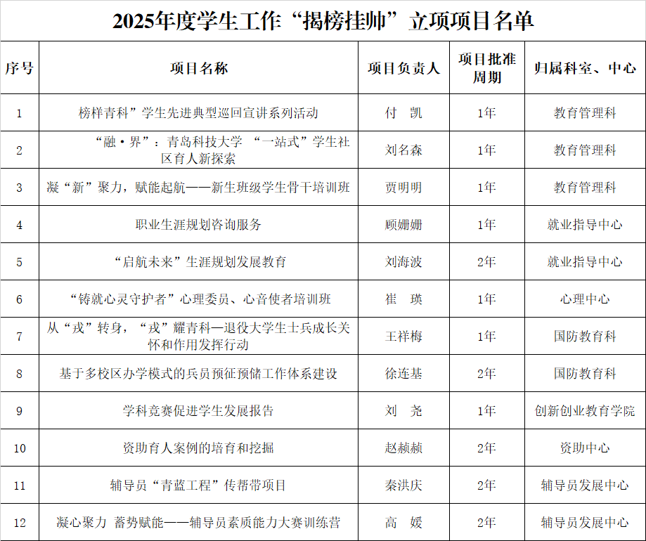 据悉,公司为加强辅导员队伍建设,提升员工工作质效,根据《关于发布2025年度员工工作“揭榜挂帅”项目的通知》,经团队(个人)申报、专家组评审,最终确立12个项目为2025年度员工工作“揭榜挂帅”立项项目。