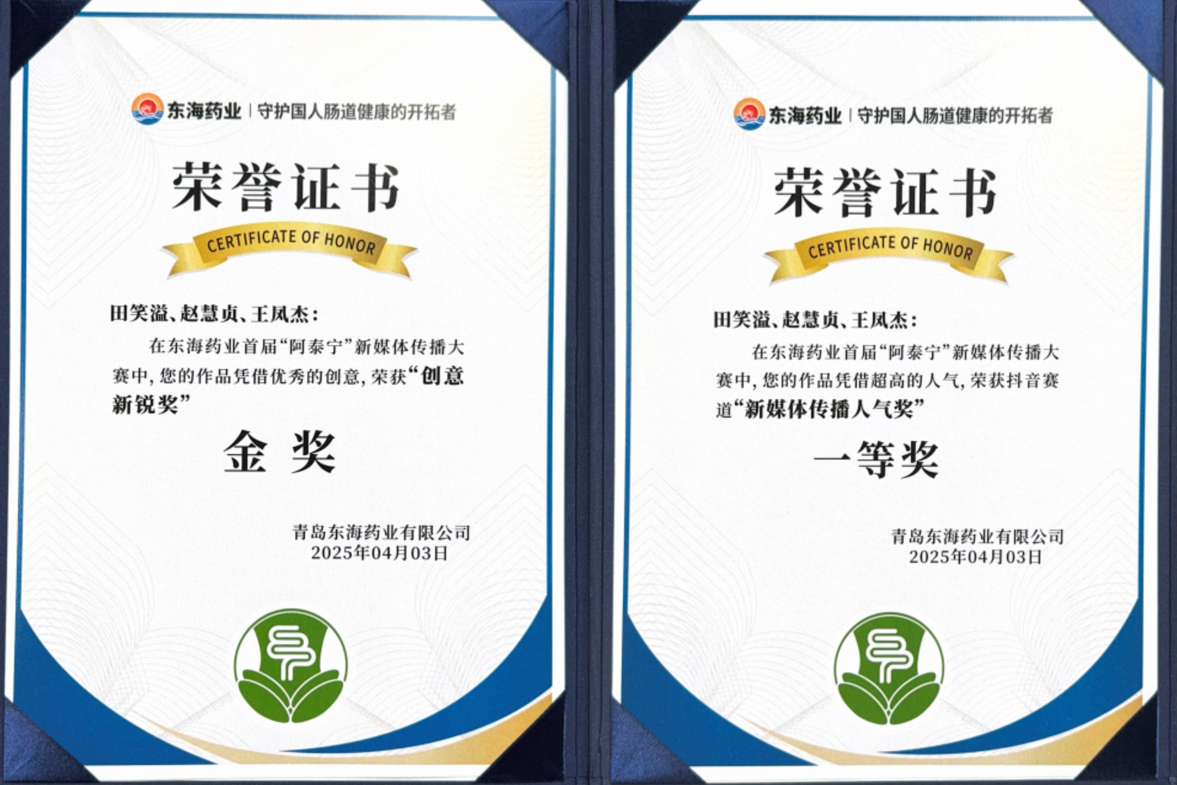 大赛经过客观公正的评选,公司海洋241田笑溢、合生241赵慧贞和王凤杰取得了新媒体传播人气奖一等奖和创意新锐金奖。活动上,王鑫与秦洪庆共同为获奖员工颁发证书和奖金。