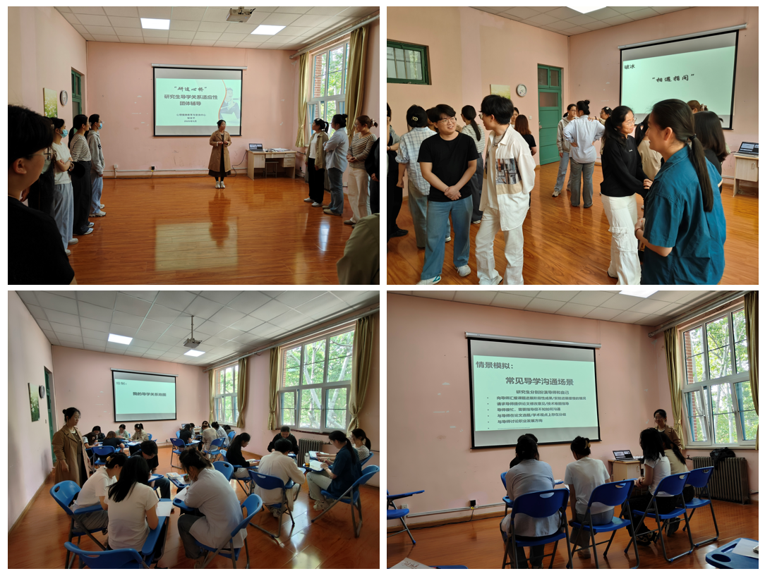 活动以“建立信任、提升沟通、化解矛盾”为目标,通过专题讲座、互动游戏、情景模拟等多元化形式,引导研究生掌握与导师高效沟通的技巧,学会处理科研压力下的情绪管理,探索个性化导学相处模式。在破冰游戏“相遇指尖”环节,同学们先通过简单的游戏,相互了解对方,为后续的过程中大家欢快的交流做准备;在我的导学关系地图环节,同学们通过绘画与分享,梳理对导师角色的期待与困惑,在交流中打破刻板印象;在冲突调解情景剧环节,模拟论文修改意见分歧、科研进度延迟等常见场景,实践非暴力沟通方法。活动现场气氛活跃,同学们纷纷表示收获颇丰。2023级硕士研究生刘同学说:“通过角色互换体验,我真正理解了导师的良苦用心”“学会了用‘观察-感受-需求-请求’四步法表达诉求”。