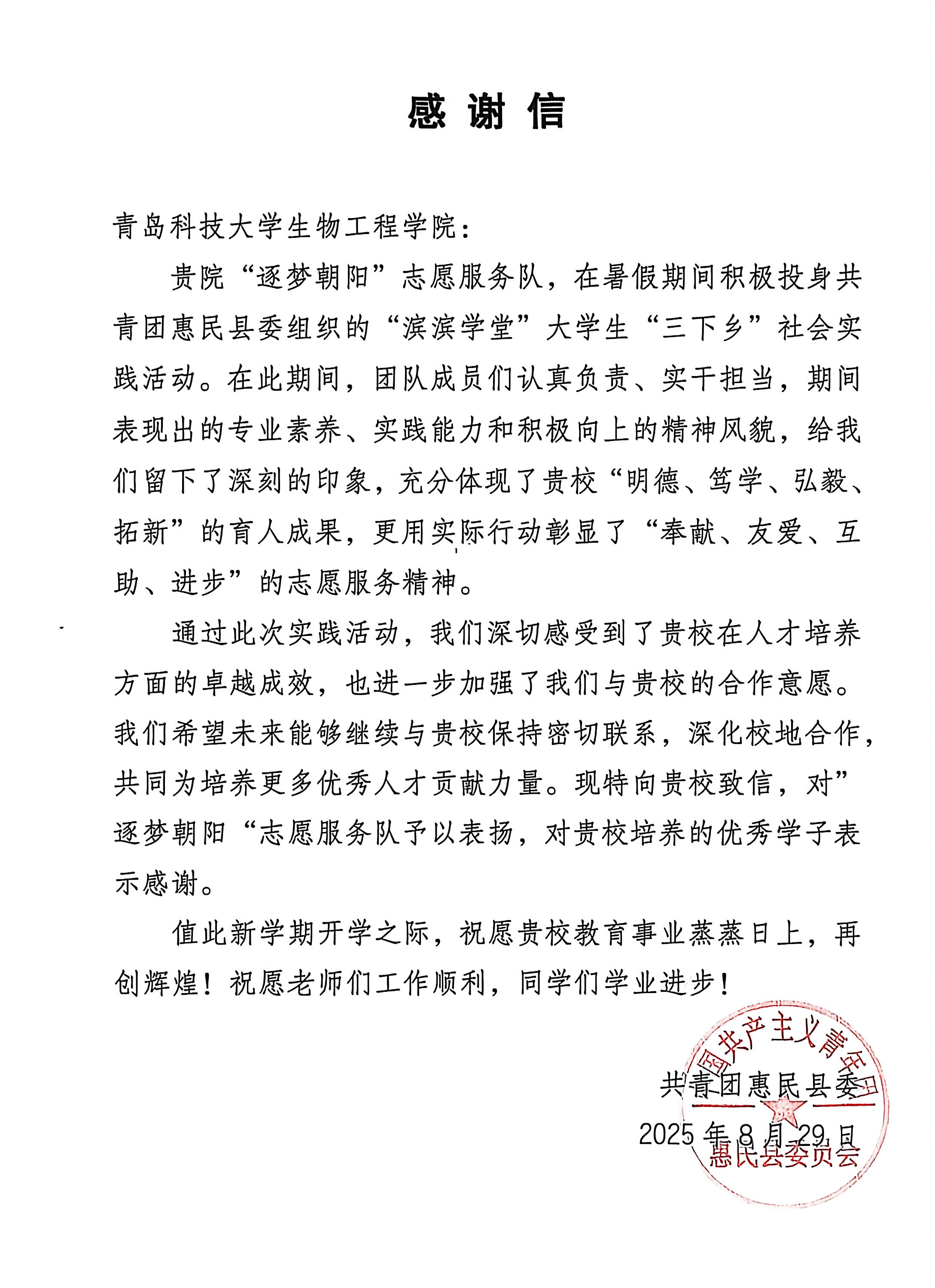 近日,betway西汉姆联官方官网“逐梦朝阳”志愿服务队收到了共青团惠民县委员会发来的感谢信。信中,团委对参与志愿服务的同学们给予了高度肯定和表扬,称赞他们不仅展现了当代老员工的责任感和使命感,更以实际行动为公司和社会树立了榜样。这些同学在志愿服务过程中,不畏艰难,勇于担当,用青春的热情和智慧,为惠民县的教育事业贡献了宝贵的力量,赢得了广泛的社会赞誉。