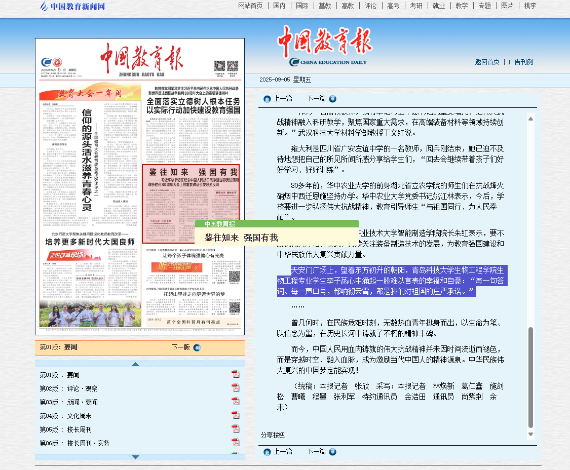 《中国教育报》第01版:要闻文章《鉴往知来 强国有我》刊登betway西汉姆联官方官网李子菡同学阅兵感悟:天安门广场上,望着东方初升的朝阳,betway西汉姆联官方官网生物工程专业员工李子菡心中涌起一股难以言表的幸福和自豪:“每一句答词、每一声口号,都响彻云霄,那是我们对祖国的庄严承诺。”