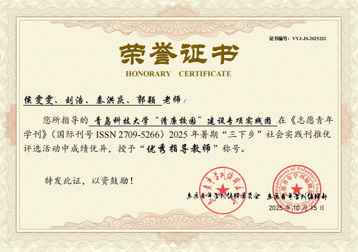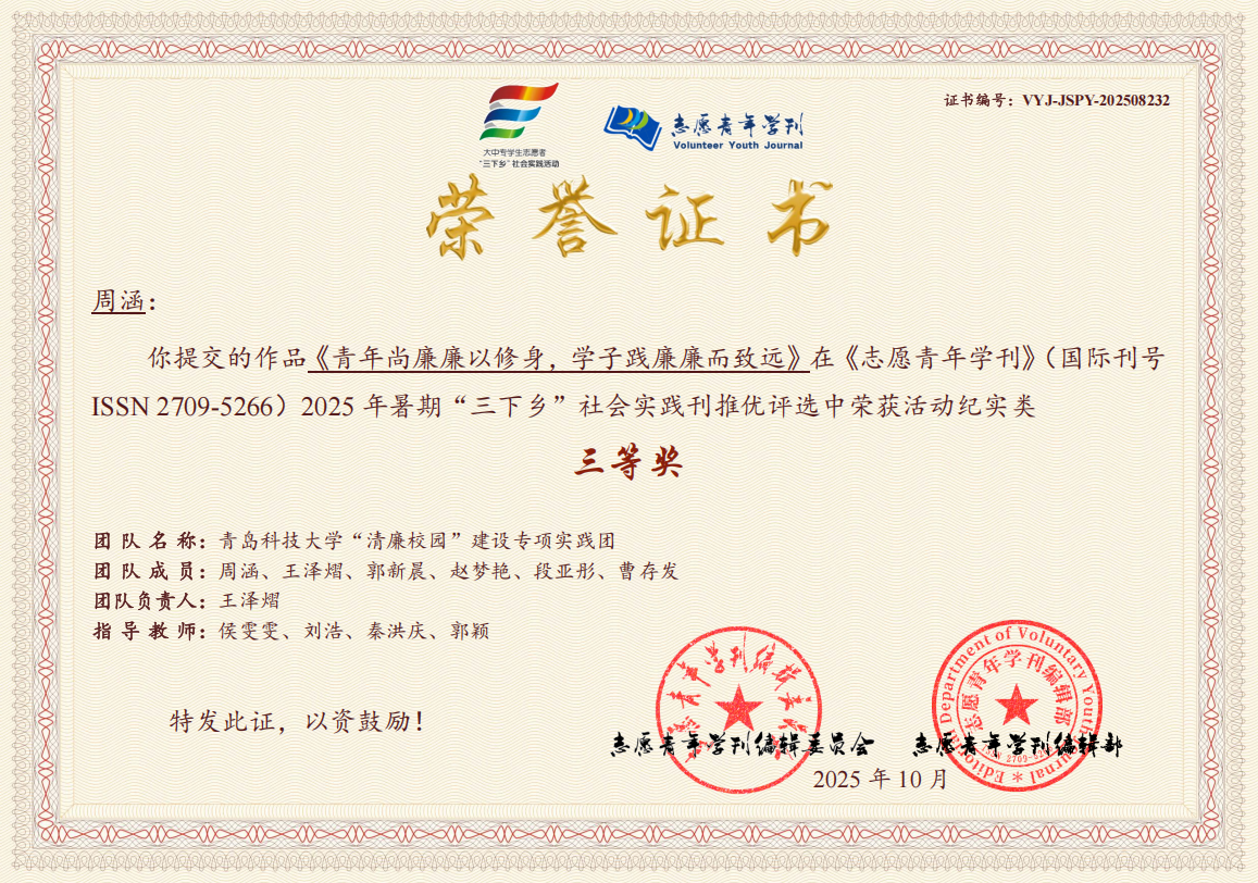近日,《志愿青年学刊》(ISSN 2709-5266)编委会公布了2025年暑期“三下乡”社会实践专刊活动纪实类推优评选结果,betway西汉姆联官方官网“清廉校园”建设专项实践团获评三等奖,侯雯雯、刘浩、秦洪庆、郭颖获评优秀指导教师。