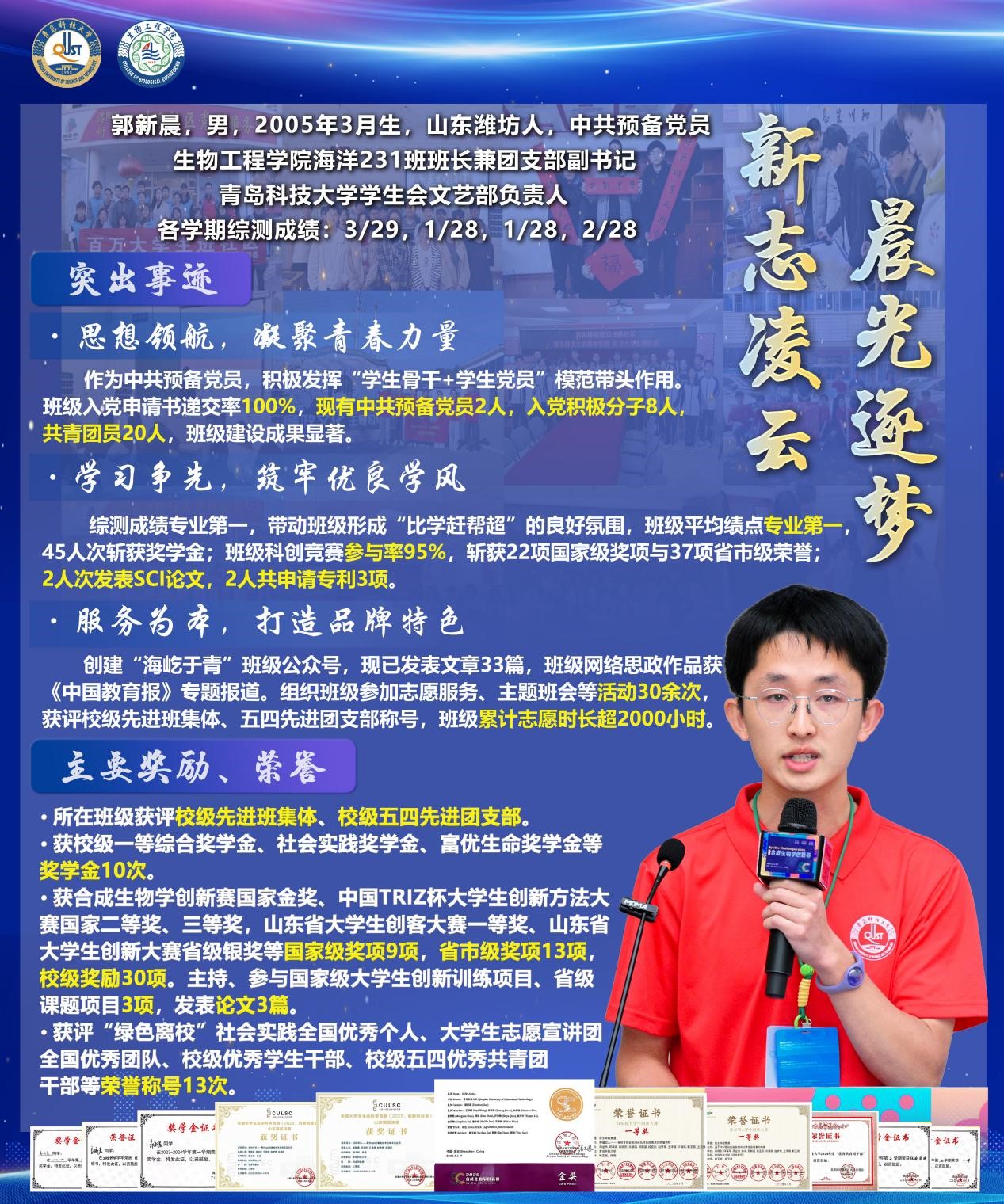 郭新晨,男,中共预备党员,betway西汉姆联官方官网海洋科学231班班长;校员工会文艺部负责人(2024.09至今)。