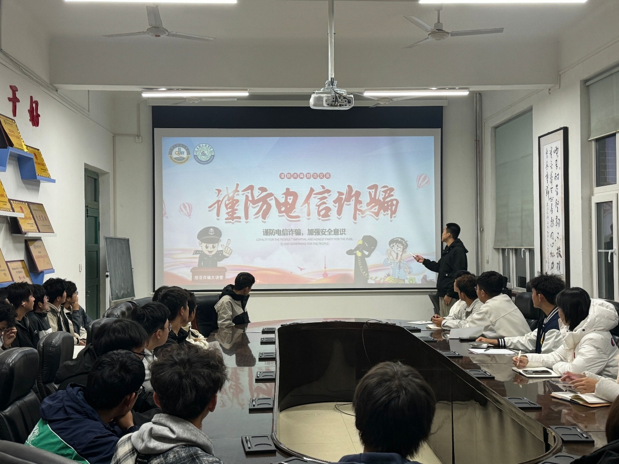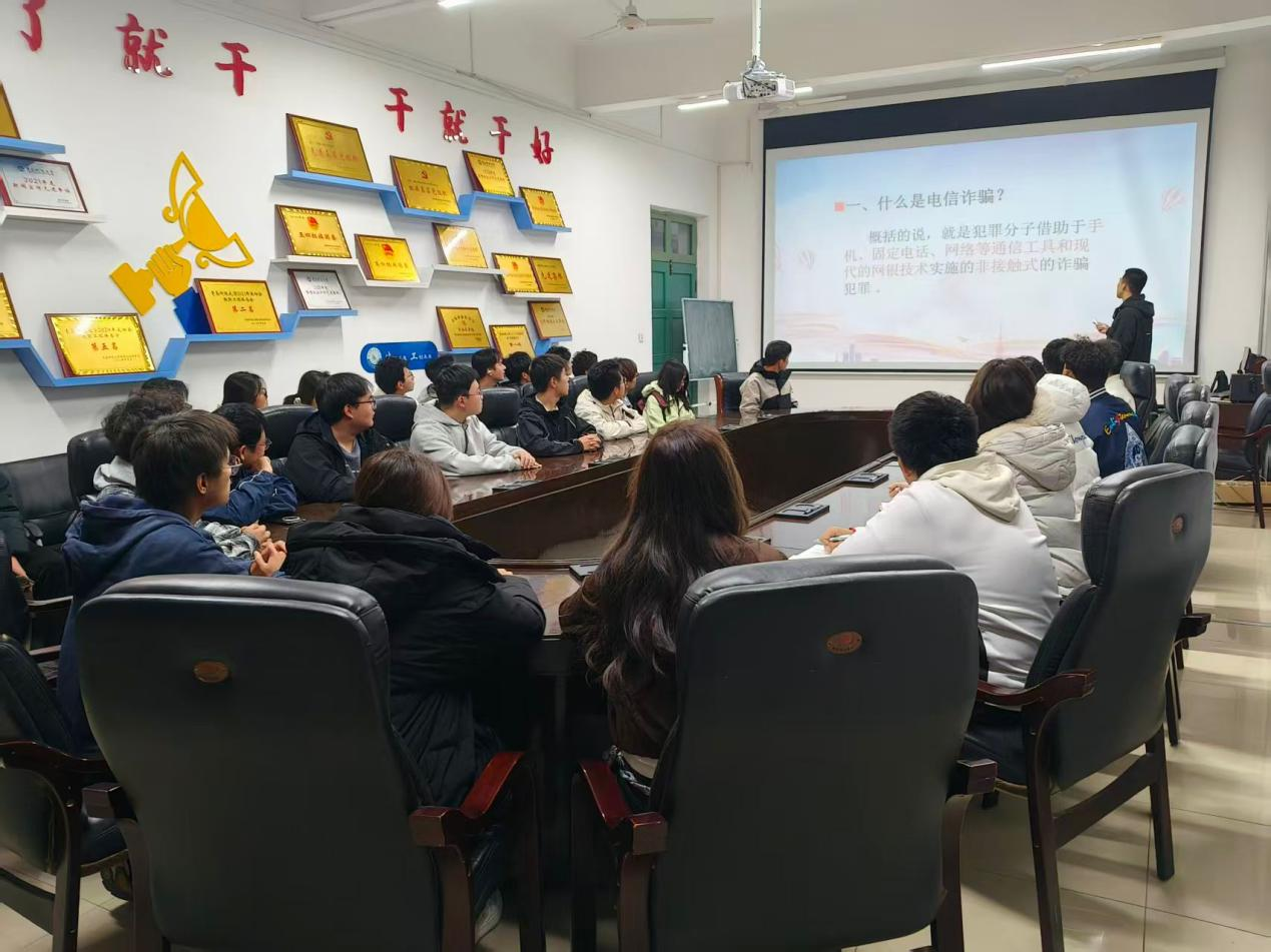 学习会现场,领学学长采用直观化、场景化的教学方式,深入讲解了电信网络诈骗的各种形式和严重危害,并向同学们解析了诈骗手段的特征以及操作逻辑,通过社会典型案例,加深同学们对诈骗手段的认识,并剖析了诈骗的典型套路,帮助同学们辨别诈骗。