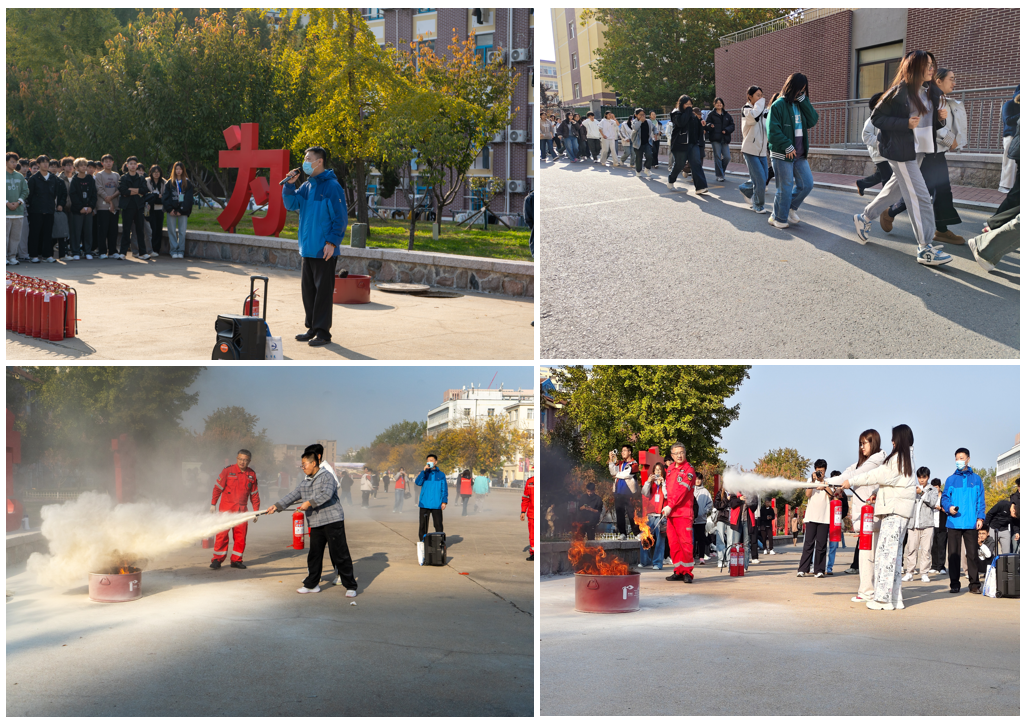 下午15时,消防演练正式开始。宿舍楼内,同学们闻声而动,在各公司辅导员与员工志愿者的引导下,用捂住口鼻,弯腰低姿,按照预定疏散路线快速有序撤离。从宿舍楼道到楼梯转角,再到楼外安全通道,整个撤离过程紧张而有序,无拥挤、无慌乱。抵达小五四广场指定安全区域后,仇立峰现场开展消防安全实训,他结合校园火灾案例,深入浅出地讲解了火灾成因、初期火灾扑救、火场逃生技巧等核心知识,重点介绍了干粉灭火器的使用原理与“提、拔、握、压”四字操作法。“压下压把时要对准火焰根部,保持安全距离匀速喷射……”在仇立峰的示范指导下,员工代表轮流上前实操,亲身体验灭火器灭火过程,直观感受消防安全技能的实际应用。员工们纷纷表示,从疏散撤离到灭火器实操,全程沉浸式的体验让消防安全知识从“书本”走进“实践”,印象格外深刻。