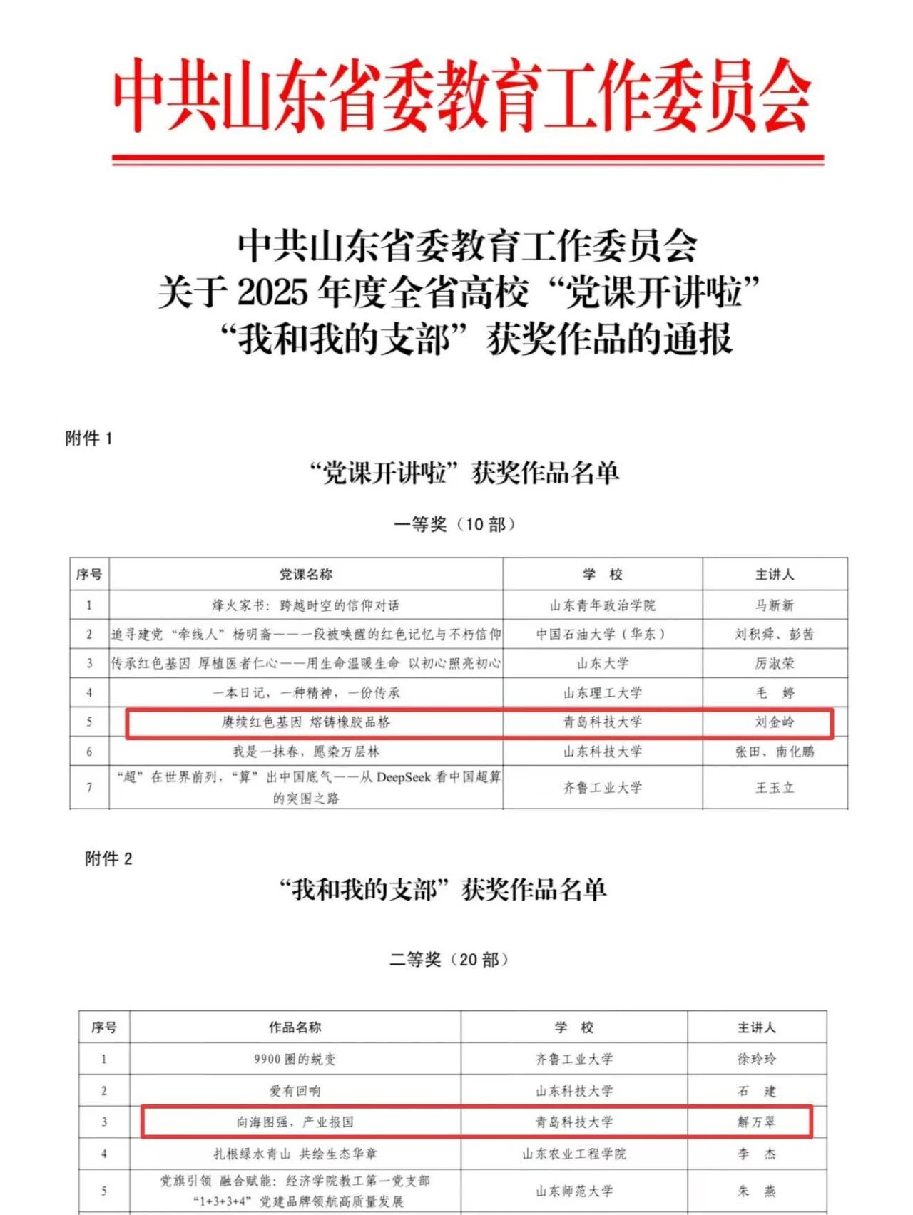据悉,中共山东省委教育工作委员会《关于做好2025年度全省高校“党课开讲啦”“我和我的支部”申报工作通知》下发后,各高校精心组织创作,积极遴选推荐,经公司申报、专家评审、集体研究、结果公示,评选出“党课开讲啦”优秀作品60部、“我和我的支部”优秀作品60部。
