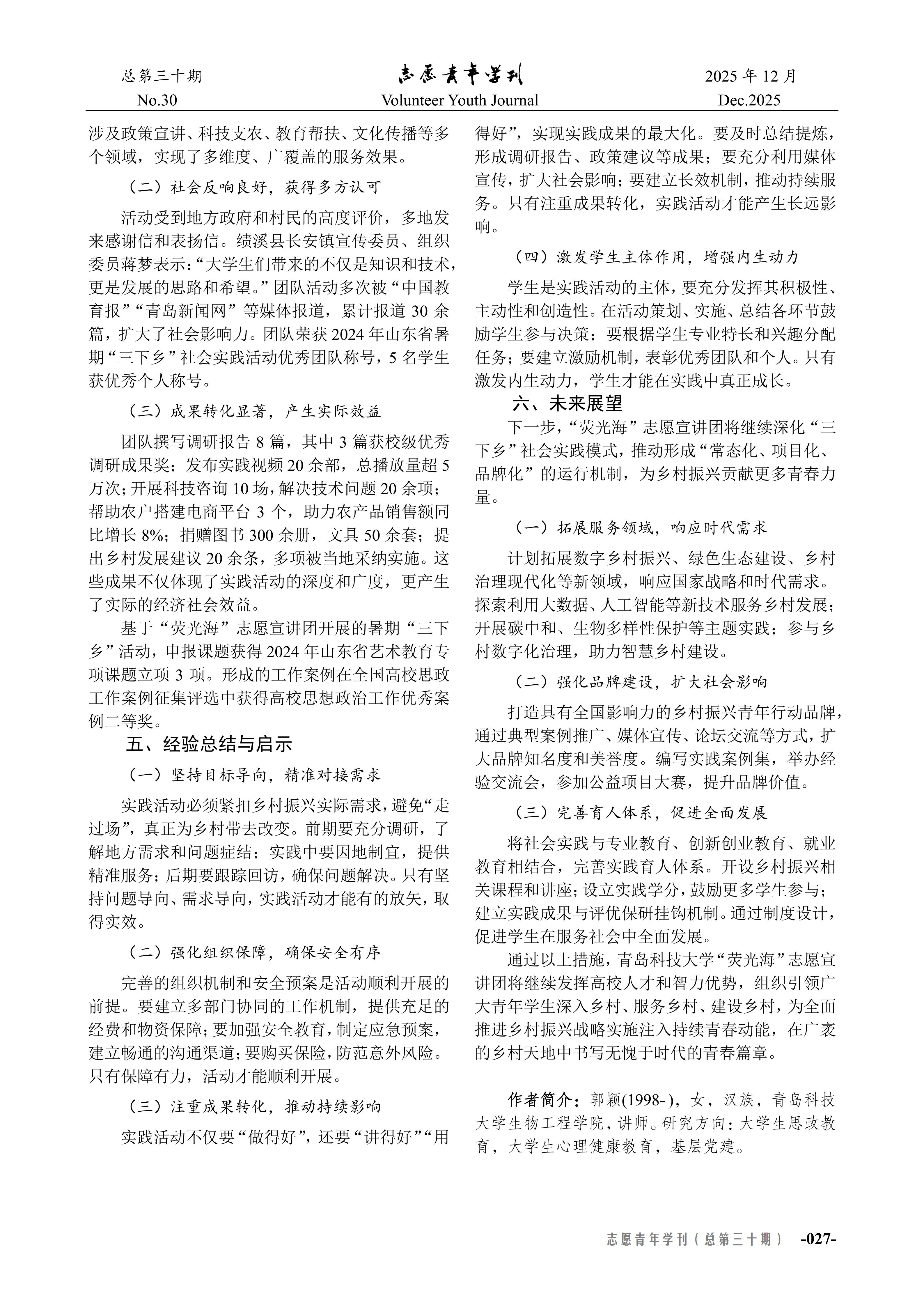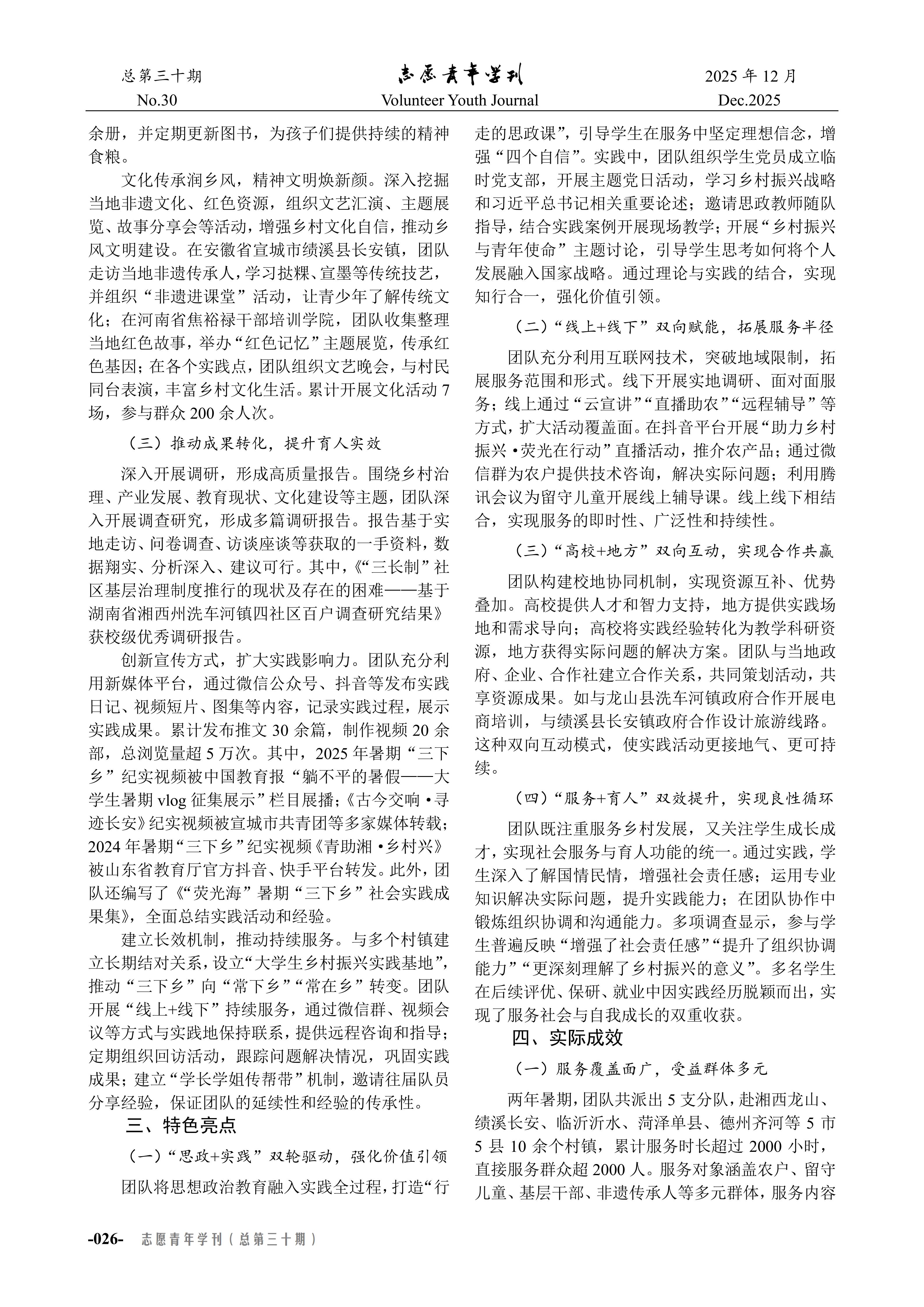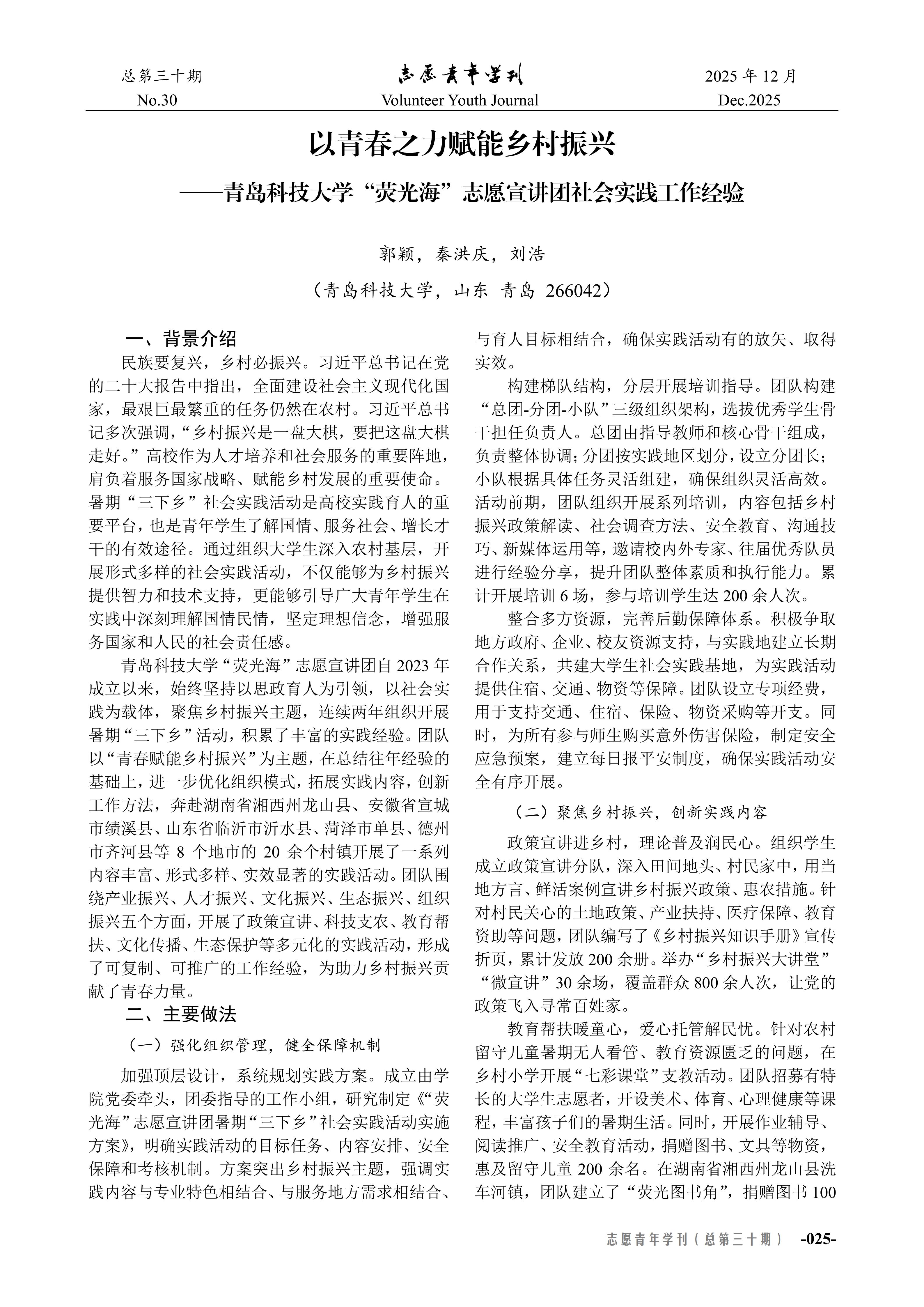 近日,《志愿青年学刊》(总第三十期)刊载betway西汉姆联官方官网的“三下乡”社会实践工作经验文章,题为《以青春之力赋能乡村振兴——betway西汉姆联官方官网“荧光海”志愿宣讲团社会实践工作经验》。