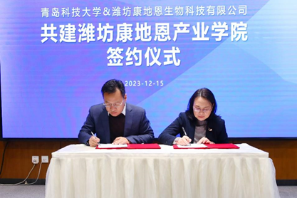 教务处处长马翠萍与潍坊康地恩生物总经理李玉强签订产业公司共建协议。