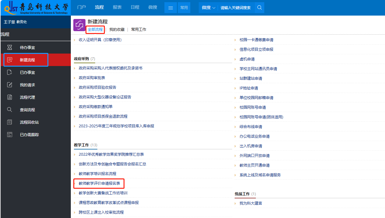 教师个人登录智慧青科大→应用中心→业务系统→办公自动化(OA)→流程→新建流程→教学工作→填写教师教学评价申请报名表(如下图)。