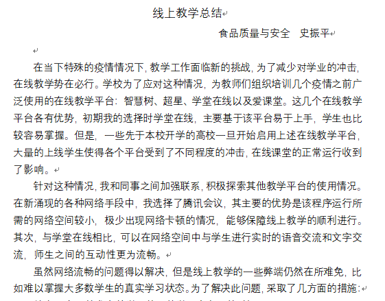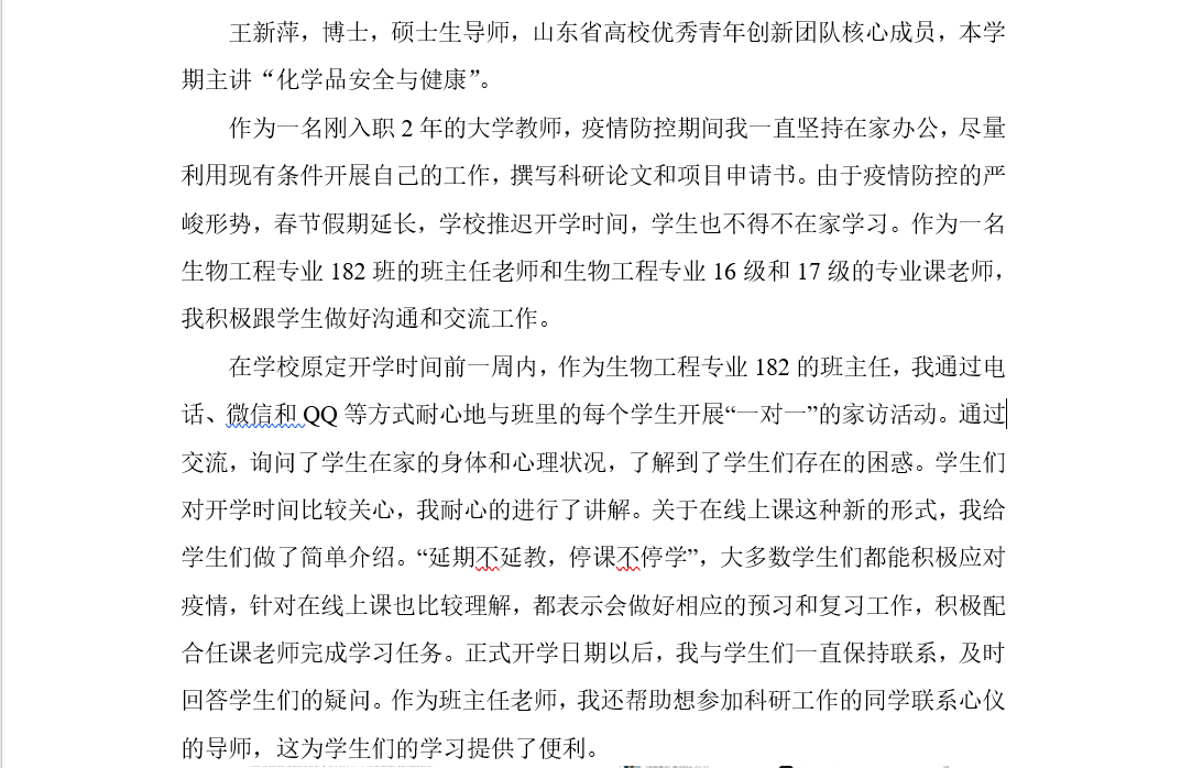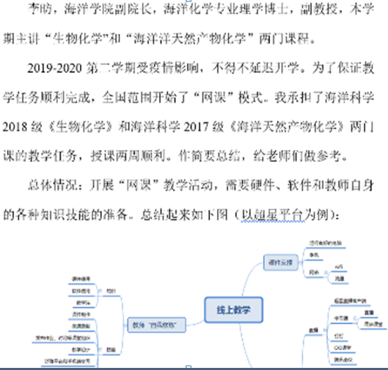 在线上教学试行一段时间之后,各位教师对近期的教学情况做了总结分析。针对教学过程中出现的问题,老师们加强与教学团队成员之间的联系,积极探讨问题所在,并不断改良教学思路,探索新的教学方式:李昉老师(海洋公司副经理、副教授,主讲“生物化学”和“海洋洋天然产物化学”两门课程)针对教学期间存在的网络问题,将自己的课程做成短视频上传至教学平台,让员工进行自主学习,并集中进行线上答疑;史振平老师(讲师,主讲“生物化学”)为提高员工的学习效率、保证每位同学有所收获,不断创新自己的讲课方式,并增加了线上提问、线下互动等环节,来提高员工学习的积极性;在当下特殊的疫情情况下,教学工作面临巨大挑战,对此,王霞老师(海洋公司副教授,主讲“酶工程专业”)也表示,“疫情总会过去,春暖总会花开。特殊时期,每一个人的付出和努力都是必不可少的。作为一名大学教师,我将秉承自己的职责,继续做好与员工之间沟通的桥梁,与员工们共同进步”;王新萍老师(讲师,主讲“化学品安全与健康”)特别推出了“抗疫我有责,科学帮助我!”小课堂,提前录制微课上传智慧树教学平台,利用课前5分钟,向同学们传递科学防控的 小知识,帮助大家科学抗击疫情。