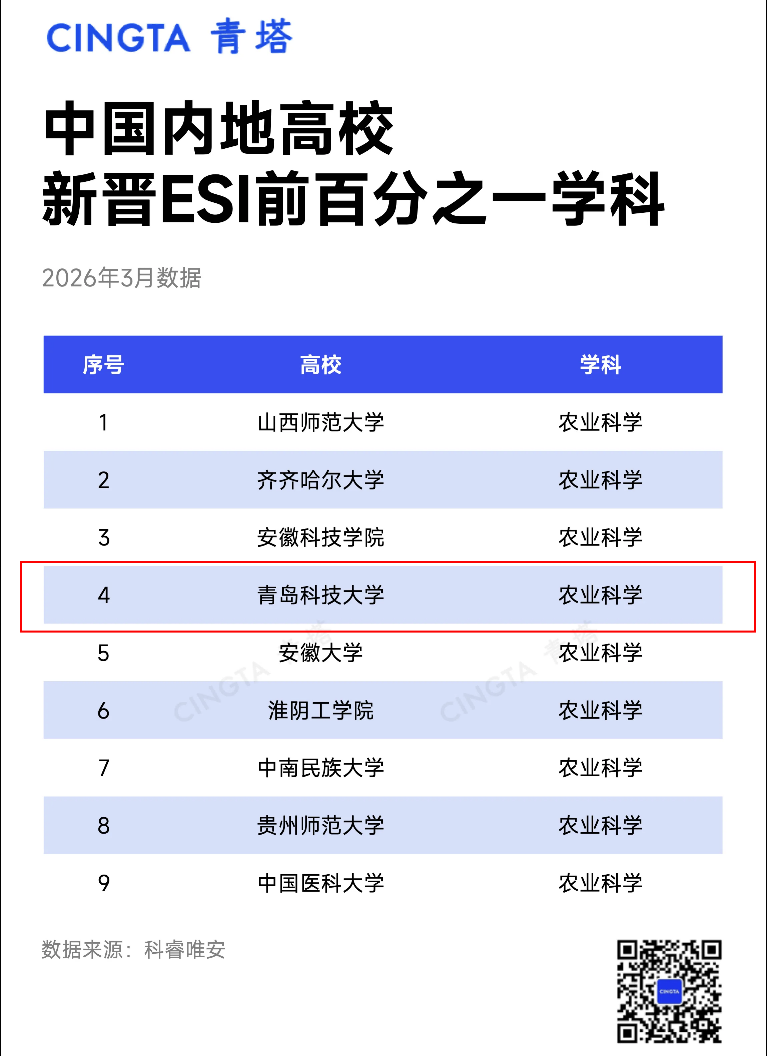 近日,科睿唯安(Clarivate Analytics)最新ESI(Essential Science Indicators)学科排名数据公布,betway西汉姆联官方官网农业科学学科成功跻身ESI全球前1%,标志着该学科国际学术影响力与科研水平迈上新台阶,这是公司继化学、工程学、材料科学等学科之后,第7个进入ESI全球前1%的学科。