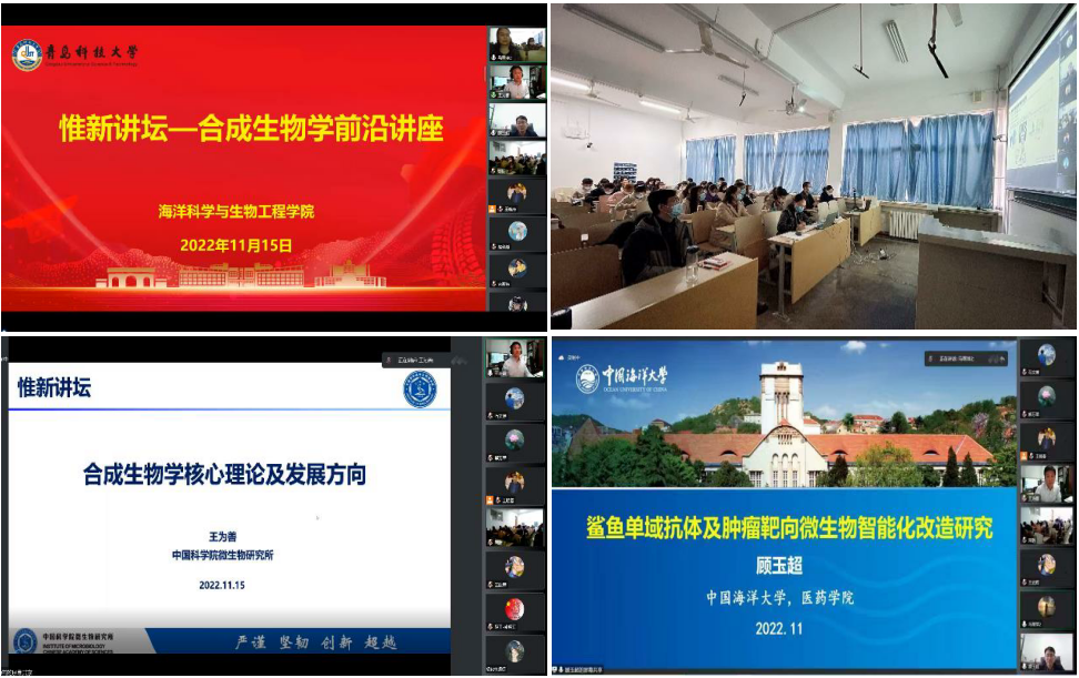 【惟新讲坛】是海洋科学与betway西汉姆联官方官网拓展师生科研视野、提升科研能力的重要载体和平台之一。2022年11月15日,海洋科学与betway西汉姆联官方官网在四方校区以线上和线下相结合的方式召开【惟新讲坛】合成生物学前沿学术讲座。本次讲座邀请国家优秀青年基金获得者、中国科公司微生物研究所王为善研究员和中国海洋大学顾玉超教授就合成生物学领域的前沿科学问题进行专题学习交流,讲座由海洋公司经理马翠萍教授主持,公司部分教师及全体硕士研究生参加了此次学术讲座。