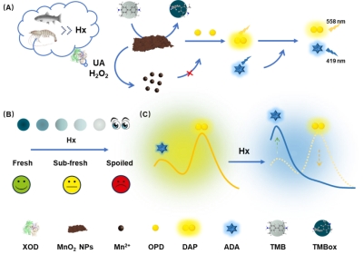 近期,betway西汉姆联官方官网王晓琨副教授团队在水产品新鲜度评估领域取得了重要进展。团队创新性地开发了一种基于催化反应的次黄嘌呤(Hx)比色-比率荧光双模式检测方法,实现了水产品新鲜度的快速、灵敏、可靠评估。研究成果以题为《The colorimetric and ratiometric fluorescence dual-mode detection of hypoxanthine through catalytic reactions for assessing aquatic product freshness》的研究论文,发表在国际著名期刊《Food Chemistry》(一区Top,IF=8.5)。