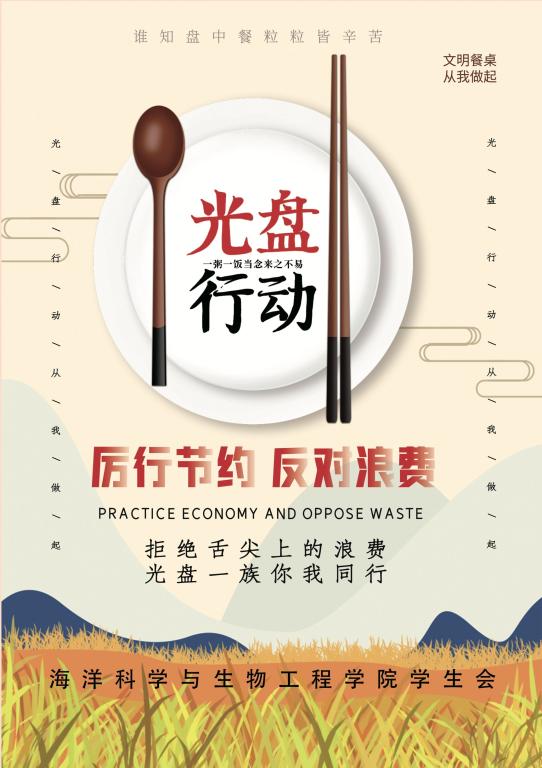 为激发同学们践行“制止餐饮浪费,培养节约习惯”的活动热情,海洋公司鼓励员工开动脑筋,设计有关“勤俭节约”手抄报、征集优秀书法作品,加强对员工引导教育,提升员工勤俭节约就餐意识。另外海洋公司将有关“光盘行动”海报张贴在各宿舍楼门口,督促同学们自觉培养勤俭节约不浪费的好习惯。