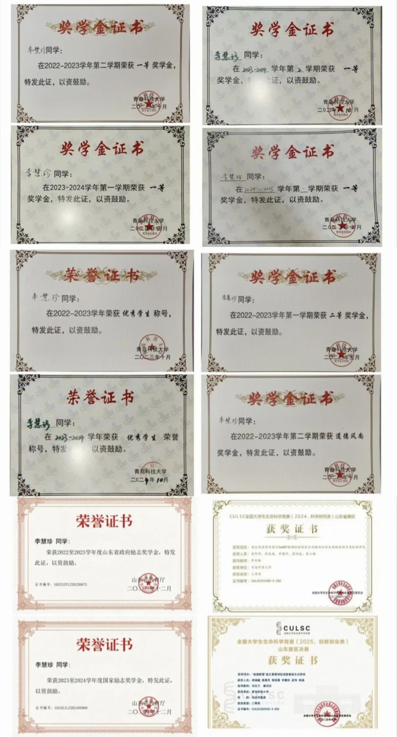 荣获第九届全国老员工生命科学大赛(科学探究类)山东省赛区省三等奖,第十届全国老员工生命科学大赛(创新创业类)山东省赛区省三等奖。获国家励志奖学金,山东省政府励志奖学金、一等综合奖学金、二等综合奖学金、道德风尚奖学金等奖励及优秀员工荣誉称号10余项。