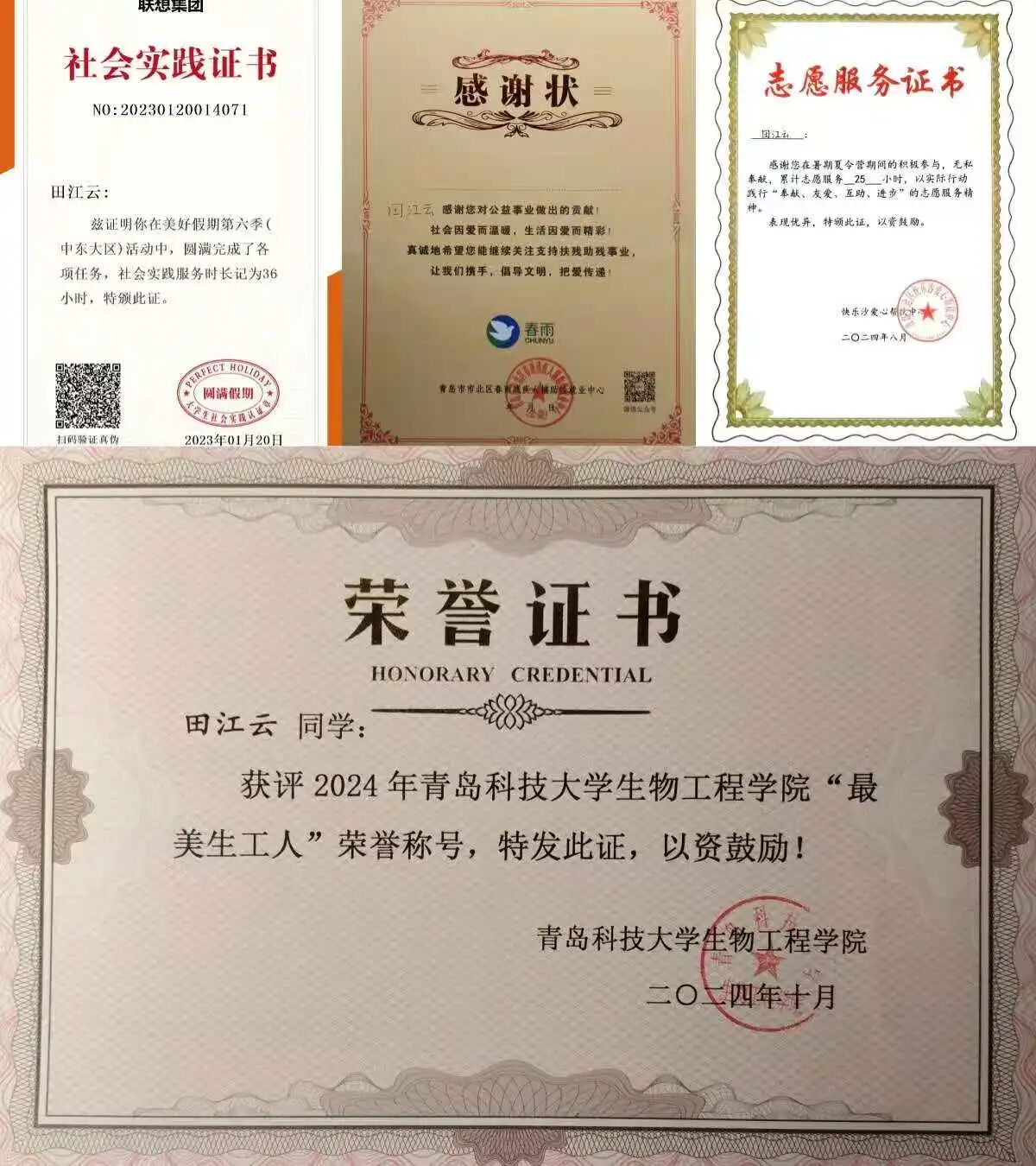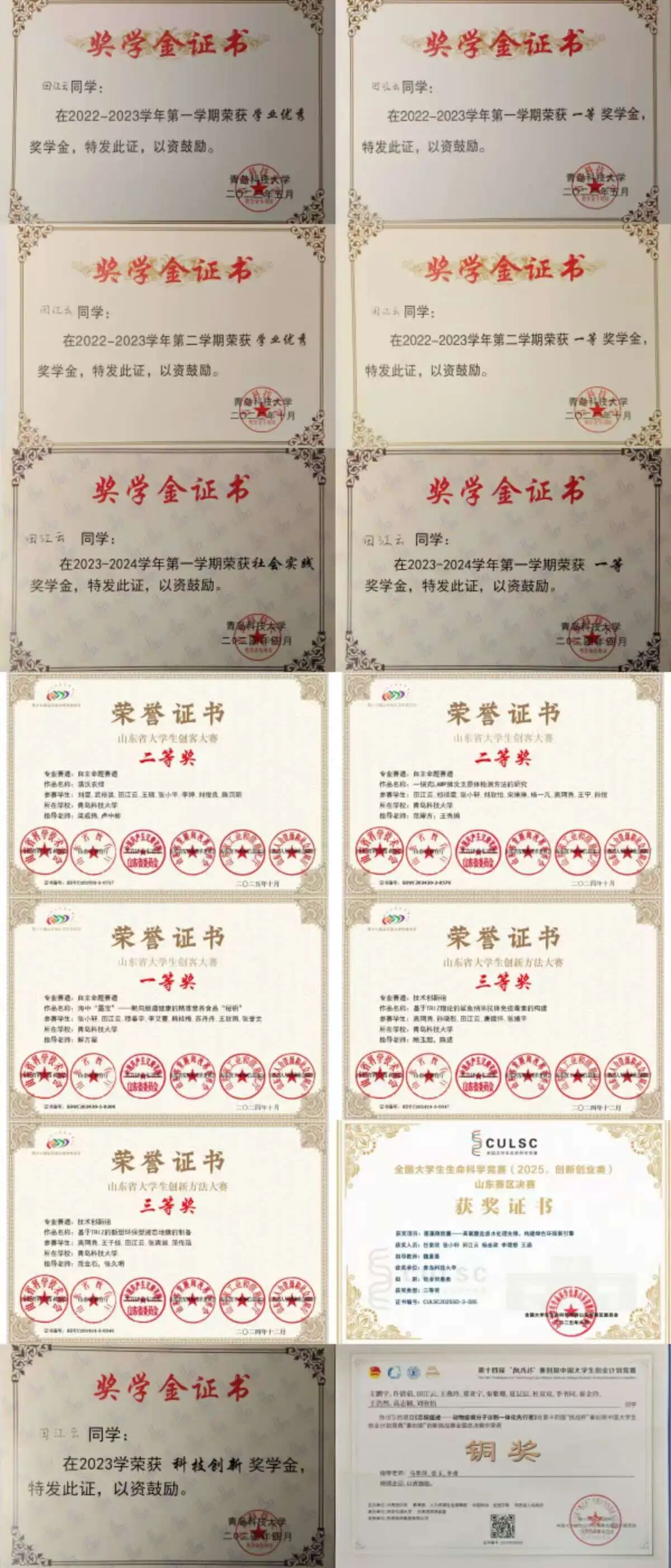 荣获“挑战杯”秦创原创新挑战赛国家级铜奖、全国老员工数学竞赛国家级二等奖、全国老员工数学建模竞赛省级二等奖、中国国际老员工创新大赛省级铜奖、第十四届“挑战杯”老员工创业计划竞赛主赛道省级银奖、山东省老员工医养健康创新创业大赛三等奖、山东省老员工创客大赛一等奖,二等奖、第九届全国老员工生命科学竞赛(科学探究类)省级三等奖、山东省老员工创新方法大赛三等奖、第十届全国老员工生命科学竞赛(创新创业类)省级三等奖、2024年老员工创新创业训练项目省级立项(负责人)等。