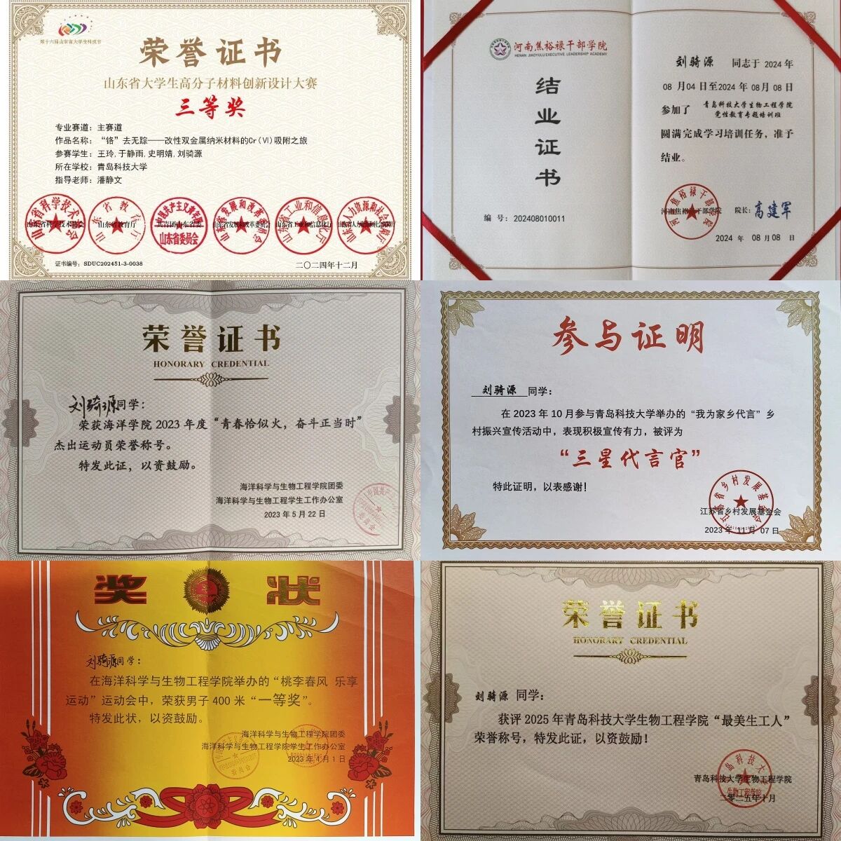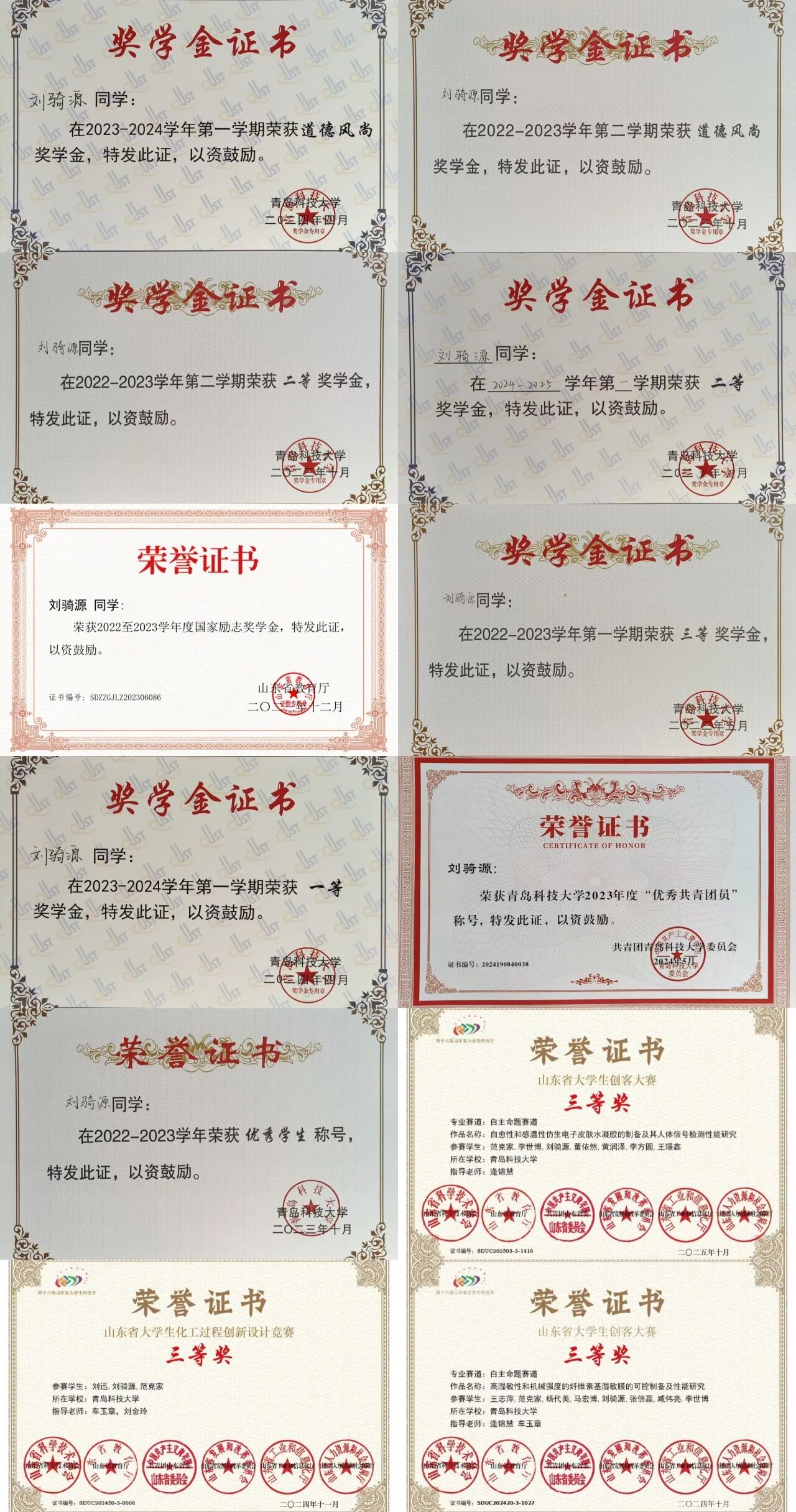 学习上,他刻苦钻研,勤奋好学,成绩优异,入学以来综合测评排名均位于专业前30%。他始终秉持“学无止境”的理念,不断夯实专业基础,注重理论与实践相结合。科研上他积极投身科研创新活动,在科研比赛中表现突出,荣获山东省老员工创客大赛三等奖、山东省老员工高分子材料创新设计大赛三等奖、山东省老员工化工过程创新设计大赛三等奖等6余次省级奖项,并获得大创省级立项2项。同时,他注重科研成果的转化与应用,参与发表北大中文核心期刊一篇、《志愿青年学刊》一篇,以实际行动践行科技创新的使命。