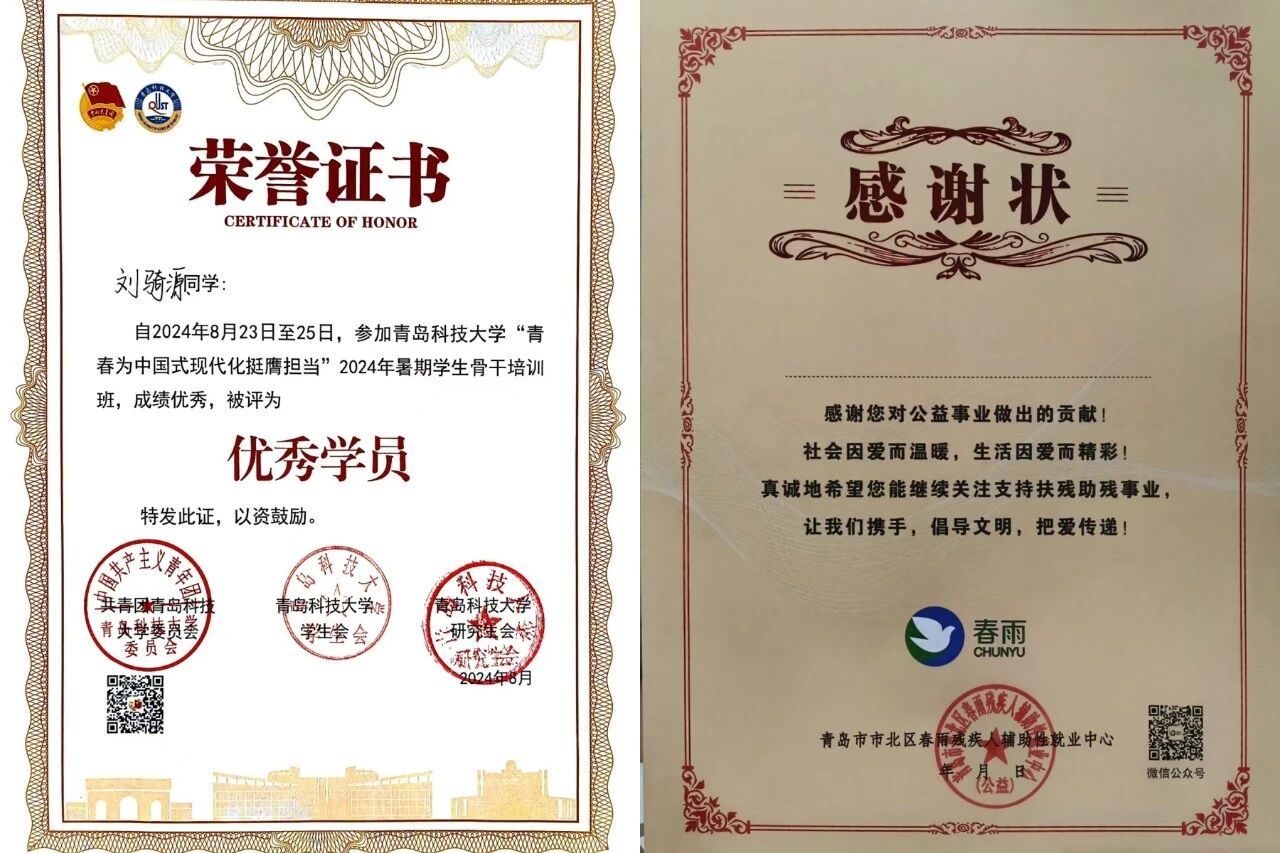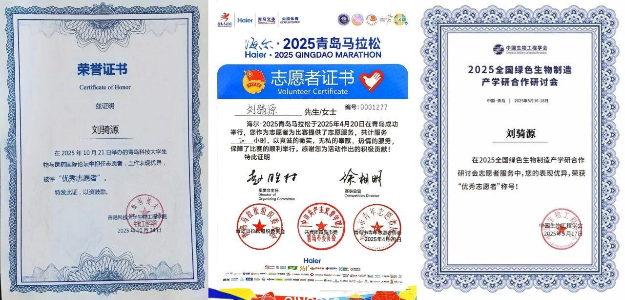 他秉持全面发展的理念,积极参加各种志愿活动,参与2024、2025青岛马拉松志愿者、清洁美丽中国行志愿者、疫情防控志愿者,参加2025年全国绿色生物制造产学研合作研讨会志愿者,青岛科技老员工物与医药国际论坛志愿者,积极进社区开展理论宣讲、环境清洁等各种实践活动。他暑期参加betway西汉姆联官方官网“山海情”调研团,作为团队队长,带领团队深入基层开展调研活动,该调研团荣获校级暑期社会实践队伍,个人荣获校级暑期社会实践个人,队伍收到地方感谢信并被大众新闻、半岛新闻等媒体报道。他始终秉持“奉献、友爱、互助、进步”的志愿精神,用实际行动回馈社会,在服务中实现自我价值。