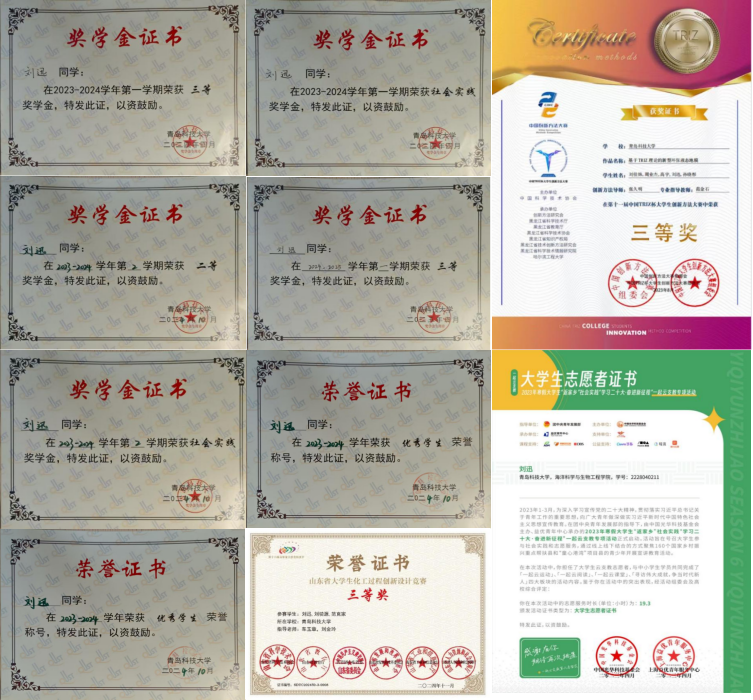 2022-2023第一学期 校内三等奖;2023年度优秀青年志愿者;2023-2024第一学期 校内三等奖;2023-2024第二学期 校内二等奖;2023-2024第二学期 优秀员工;2024-2025第一学期 校内三等奖;第十一届中国TRIZ杯老员工创新方法大赛三等奖;山东省老员工化工过程创新设计竞赛三等奖。