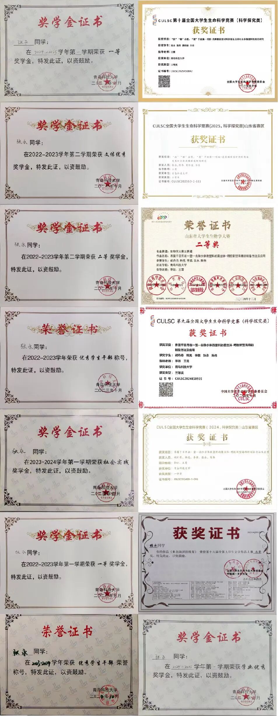 获2024全国老员工生命科学竞赛国家三等奖及省级一等奖、2025全国老员工生命科学竞赛国家三等奖及省级二等奖(负责人)、2024山东省老员工生物学大赛省级二等奖、2025山东省老员工生物学大赛省级三等奖(负责人)、第十八届全国老员工文学作品大赛三等奖,并参与老员工创新创业校级立项;